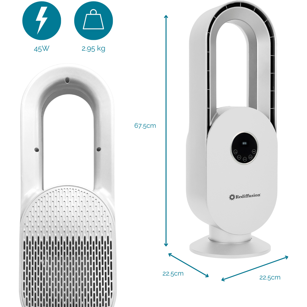 Enjoy consistent, even cooling throughout your room with the Rediffusion White Bladeless Fan. Its sleek design offers customizable wind modes: normal, natural, and night, creating the perfect ambiance. The 55-degree oscillation ensures complete room coverage with a pleasant, evenly distributed breeze. The simulated natural wind setting provides a soothing, refreshing feel. This energy-efficient fan delivers cost-effective cooling without compromising comfort. Easy controls and hassle-free cleaning make it a simple and refreshing addition to any home.