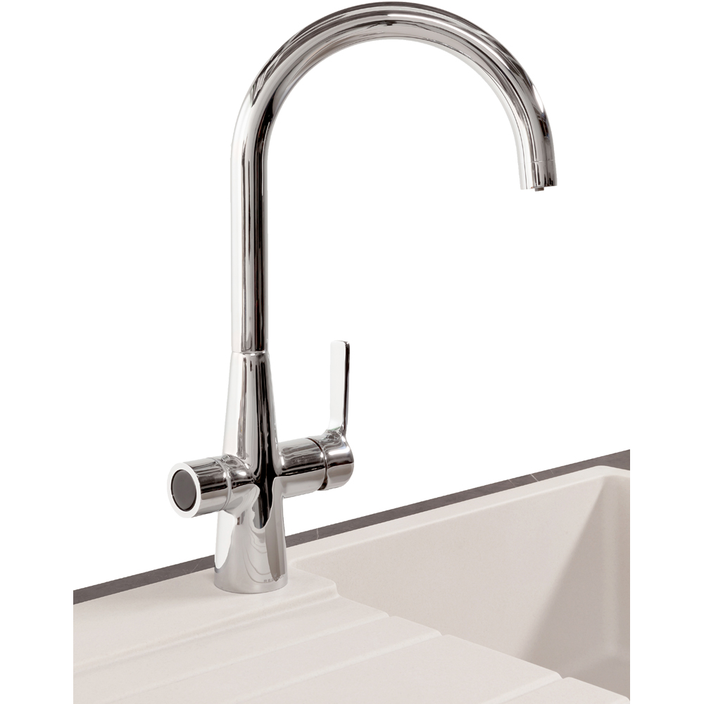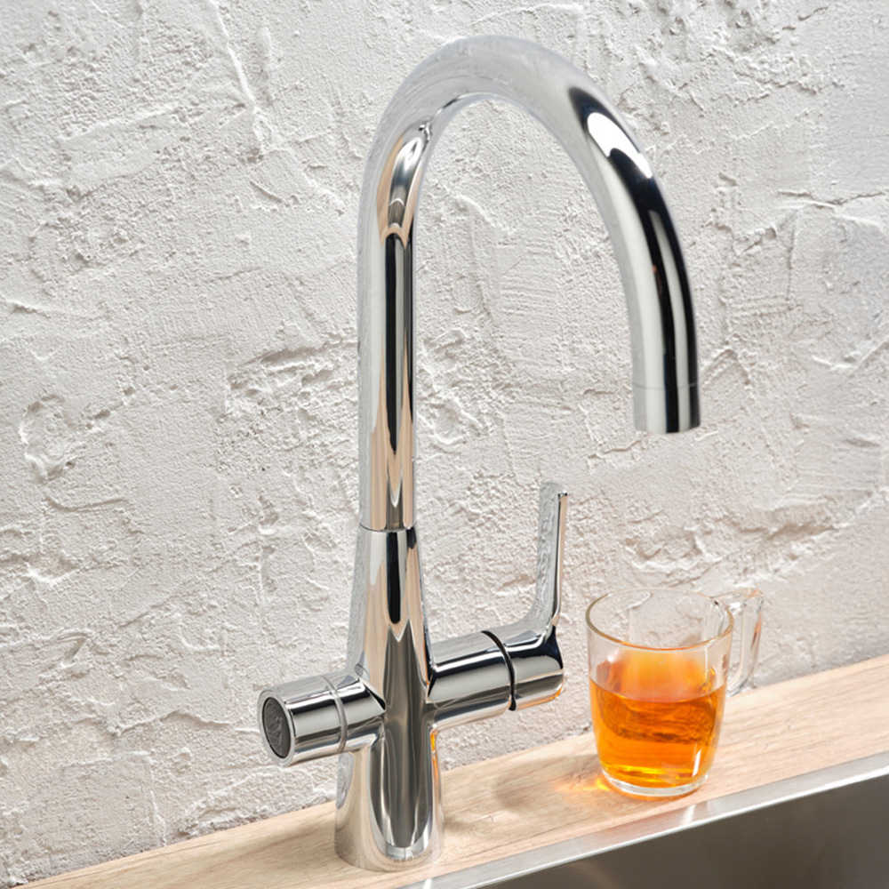 The Aquadzi 4-in-1 tap is an essential addition to any contemporary kitchen. Boasting a graceful swan neck design with a polished chrome finish, this tap delivers standard hot and cold water, filtered cold water, and filtered instant hot water at 98 degrees Celsius. The package includes the tap itself, a 2.4-litre tank, a filter, and a descaling kit. Featuring user-friendly touch technology for instant hot water operation, the filter requires replacement every 3-6 months. Registration with Water Solutions Direct is necessary to ensure comprehensive aftercare under the warranty.