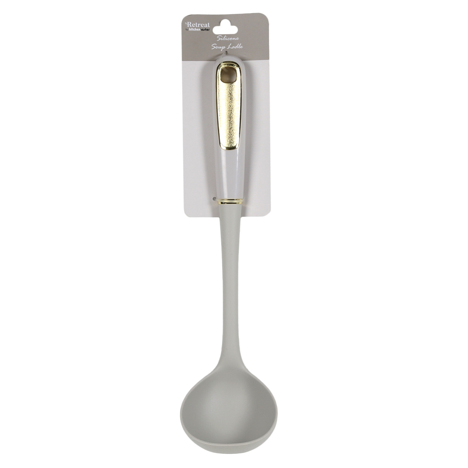 Upgrade your kitchenware with the Retreat Silicone Soup Ladle. Its simple grey body and golden accents bring a modern feel to your cooking. Ideal for serving soups, stews, and more, this ladle features a thoughtfully designed hanging hole for convenient storage. A must-have for any kitchen.