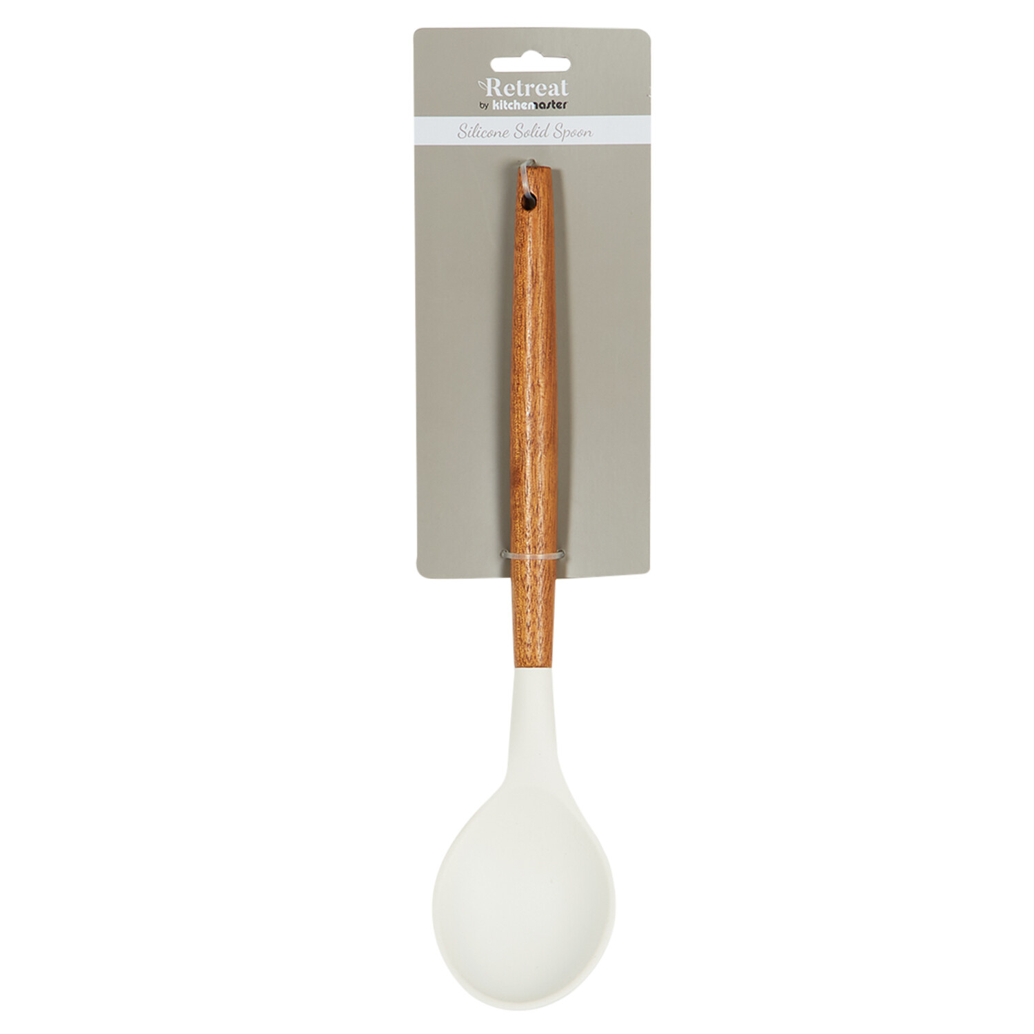 Enhance your kitchen's efficiency and style with the Retreat Silicone Solid Spoon. Its heat-resistant silicone head (up to 260 degrees) is gentle on cookware, anti-scratch, and ensures food safety. The comfortable, natural acacia wood handle provides a secure grip. Conveniently hang it for storage using the integrated loop—a perfect complement to other Retreat collection pieces.