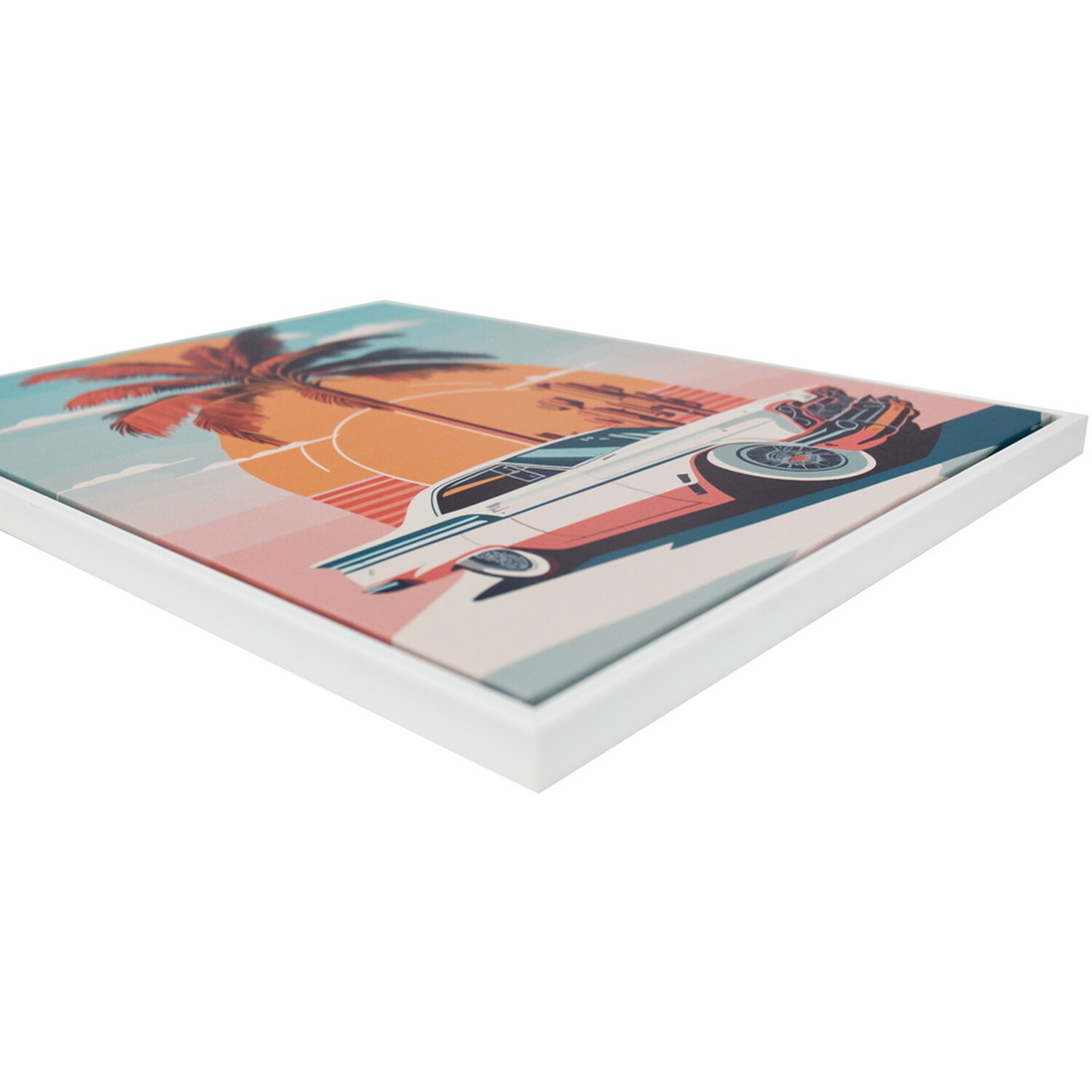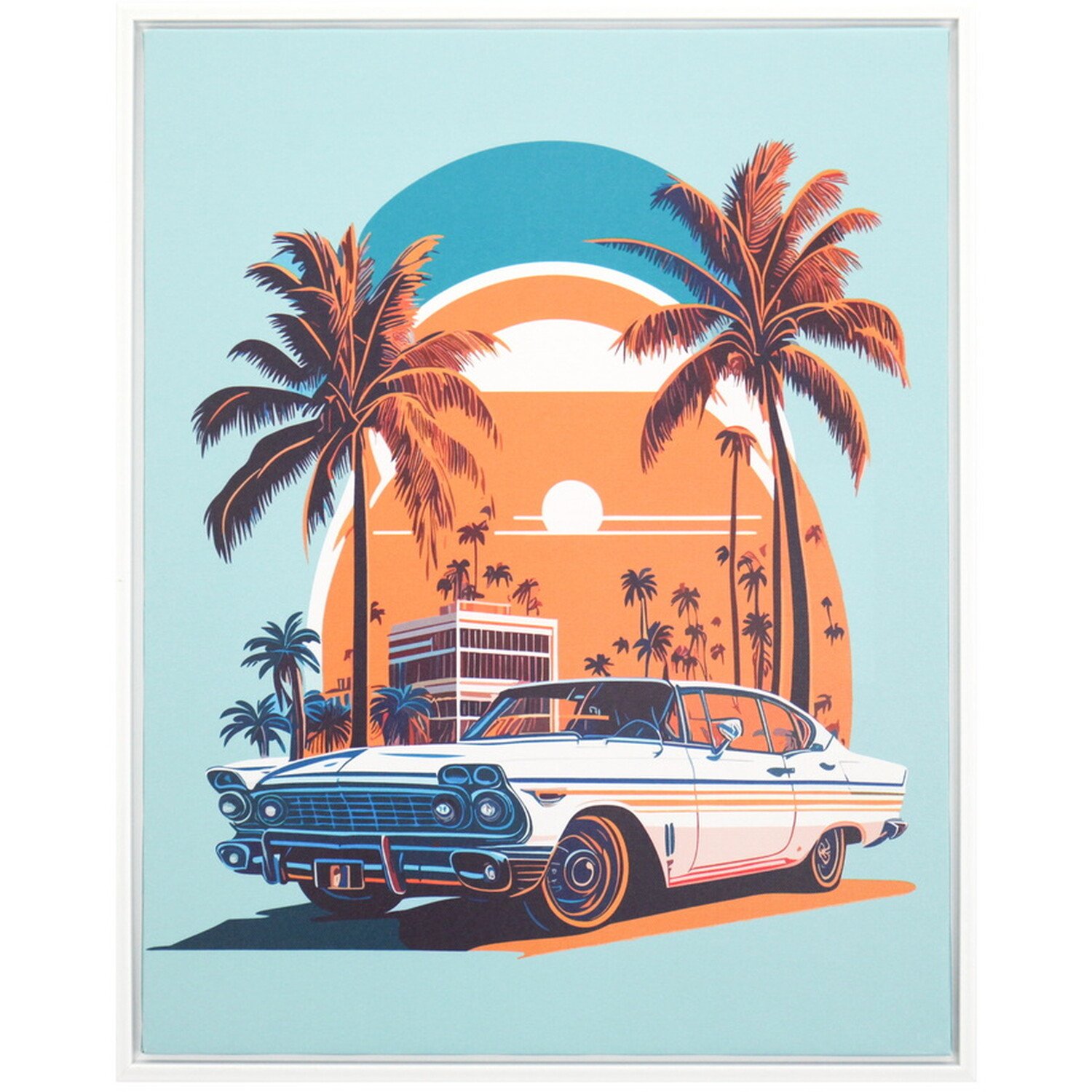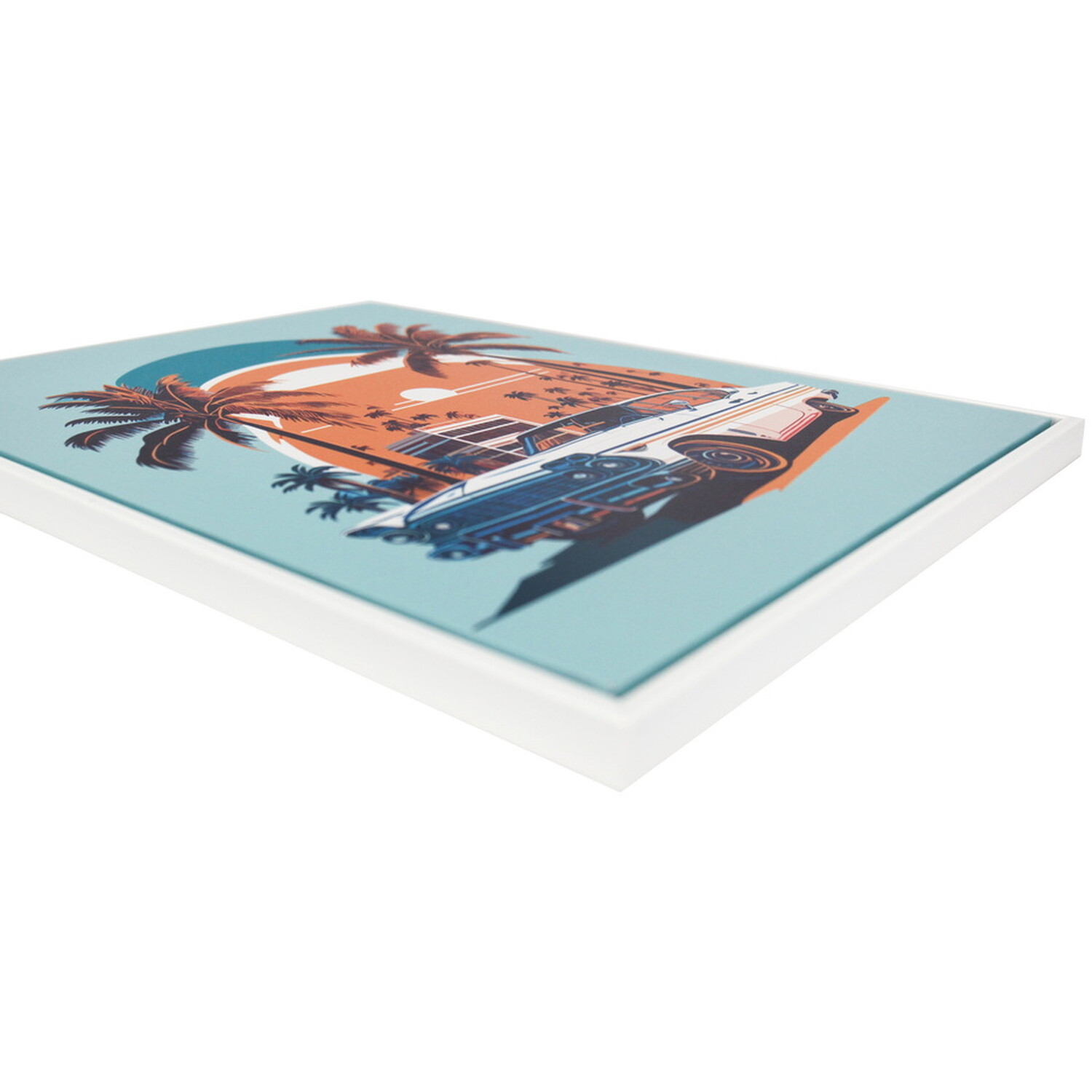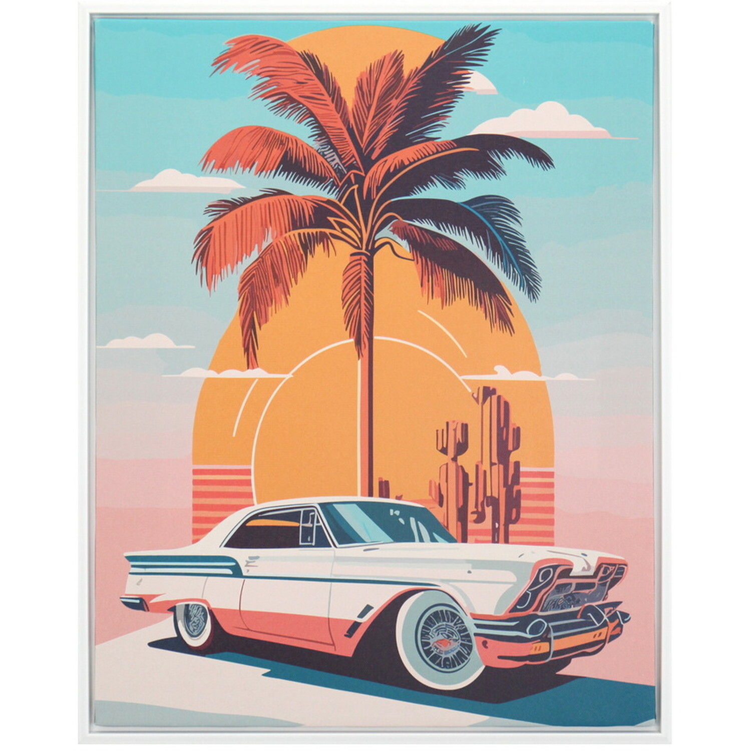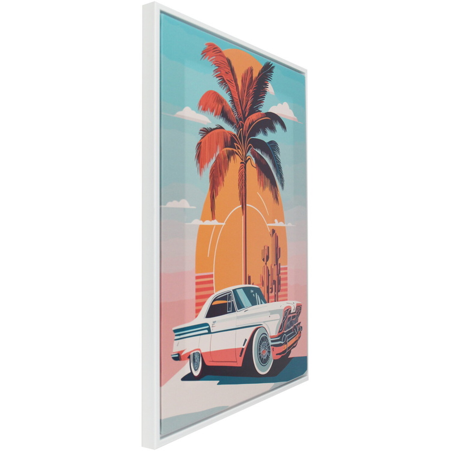 Bring a touch of vintage charm to your home with this framed print depicting a retro car at sunset. Featuring two delightful designs, each showcases a classic car set against a vibrant sunset backdrop in a stunning tropical location. A perfect choice for those who appreciate retro aesthetics, this print adds timeless appeal to any interior.