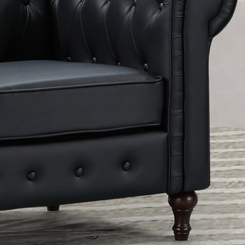 Elevate your interior with the Richland two-seater black leather sofa. Perfect for home or office, this stylish, Chesterfield-type suite features a solid hardwood frame, a sprung and foam-filled interior and is upholstered in durable bonded leather, with faux leather used in lower-stress areas. Arriving conveniently unassembled in a box, this sofa is ideal for navigating tight spaces. Worry not about setup, as our white glove delivery team will assemble it for you, free of charge.