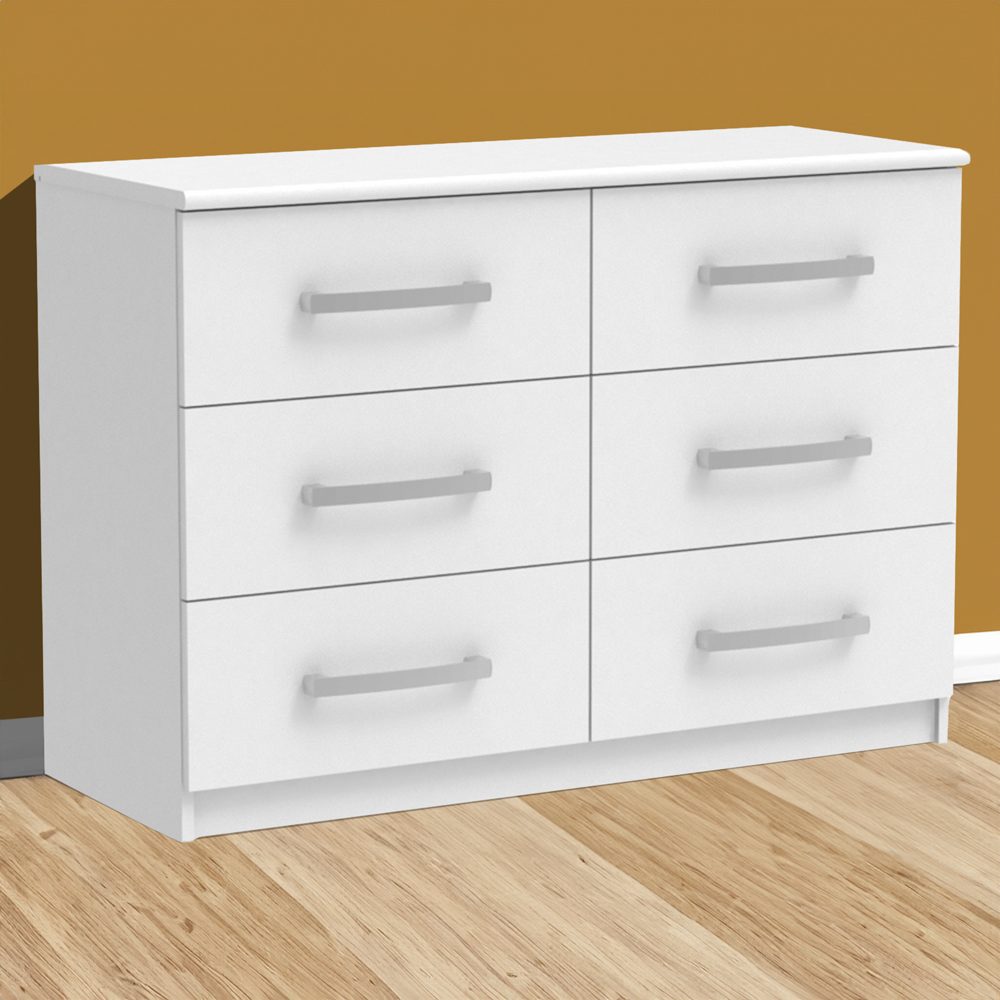 This Riviera Wide Six Drawer Chest offers ample storage in any room. Its high-quality particleboard construction, with an attractive oak effect finish, ensures durability. Six spacious drawers, each with chrome effect handles, glide smoothly open. The large flat top is perfect for displaying decorative items. Ideal for bedrooms, studies, or living rooms, its elegant natural shade complements many décor styles. Keep clothes, stationery, crafts, or cosmetics neatly organised.