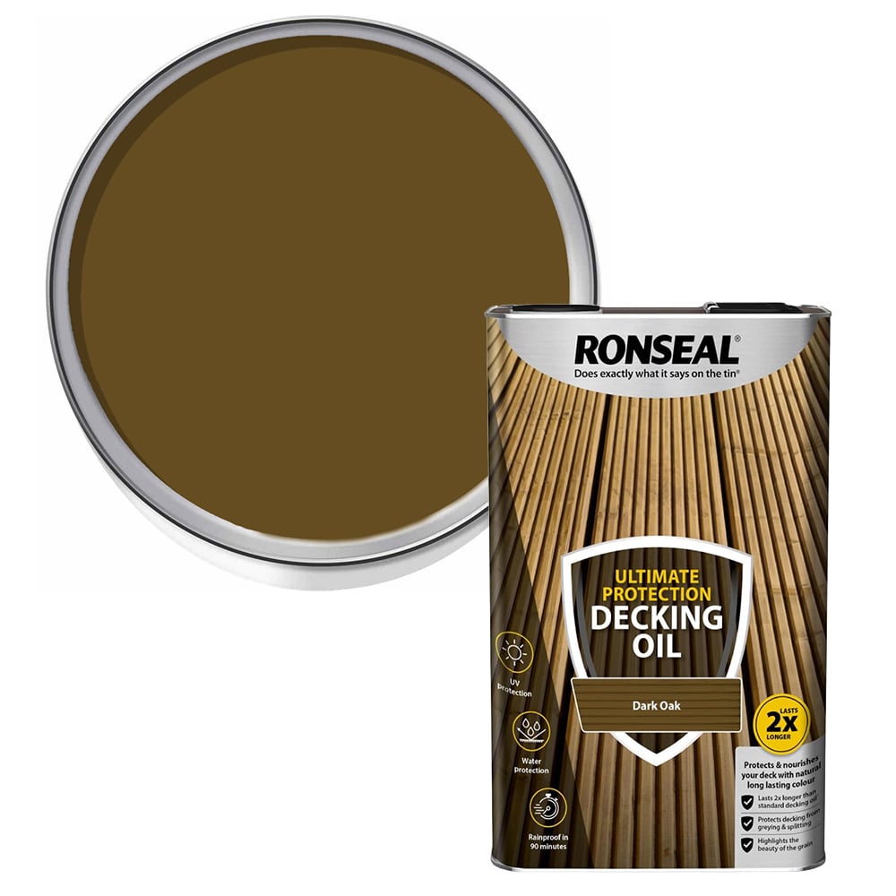 Keep your decking looking its best with Ronseal Ultimate Protection Decking Oil in Dark Oak. This 5L tin is designed to nourish and protect your deck, preserving its natural beauty for longer. Thanks to its water-based Linseed Oil technology, the unique formula penetrates deeply to provide lasting protection against the elements and everyday wear and tear. More than just protection, this oil enhances the natural look of your deck with a lightly tinted Dark Oak finish, whilst also waterproofing it in one simple step. Rainproof in just 90 minutes, this oil is ideal for pre-treated decking, offering quality and reliability for all your outdoor projects. Colour: Dark Oak. Capacity: 5L.