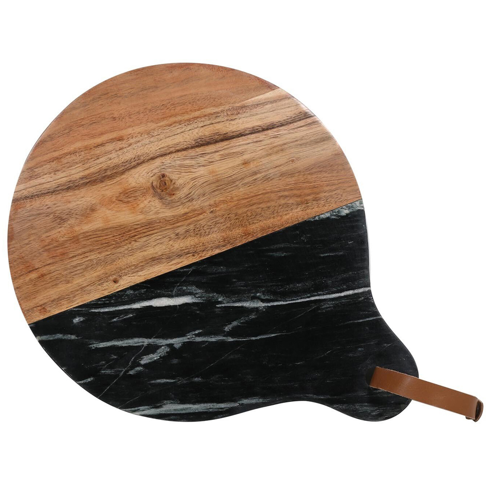 This stylish Round Black Marble Acacia Board is perfect for food preparation and serving. Its striking 50/50 black marble and wood design offers a versatile look, complemented by a traditional leather-look loop handle for easy hanging from any kitchen hook. Add a touch of elegance to your kitchen.