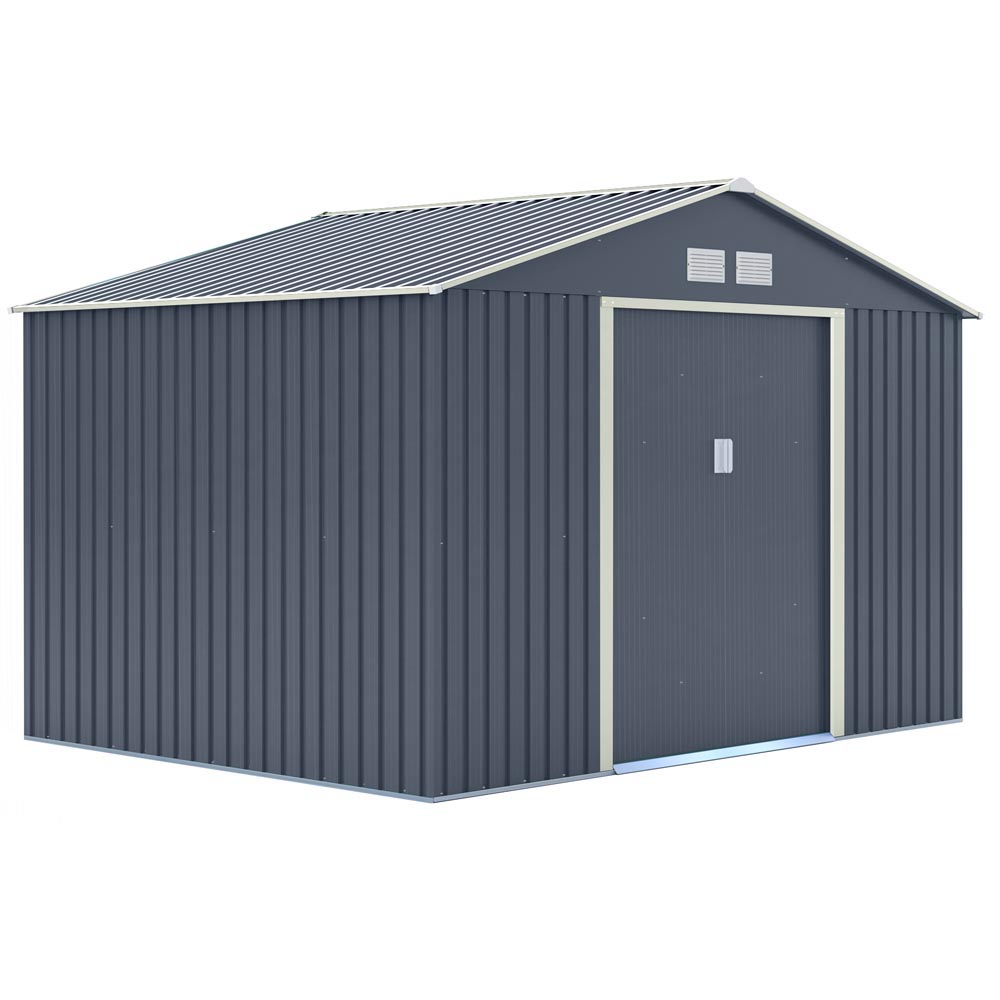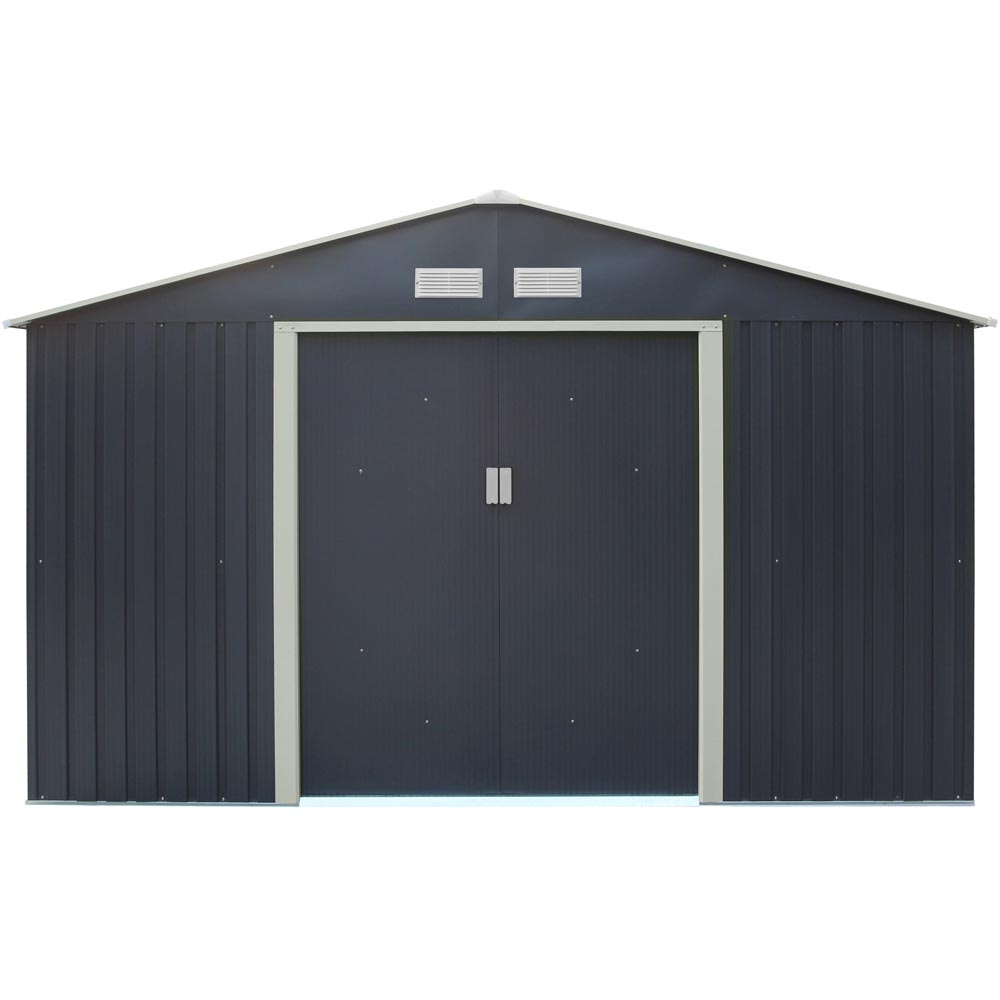 Transform your garden storage with the Rowlinson Trentvale 10 x 8ft metal apex shed, designed to keep your equipment safe and dry. This sleek, low-maintenance alternative to traditional timber sheds features a durable metal construction that is both attractive and resilient. With double sliding lockable doors, your belongings will remain secure, while gable vents enhance air circulation within. The spacious interior is perfect for organising all your gardening tools and equipment. Fire and rot-resistant, this shed offers peace of mind that your valuables are protected. Finished in a stylish dark grey with off-white trim, the Trentvale shed is available in various sizes to suit your needs. Enjoy hassle-free maintenance, allowing you to focus on your garden. Internal dimensions: H1950 x W3110 x D2310mm. Door dimensions: H1570 x W1300mm.