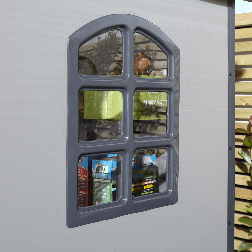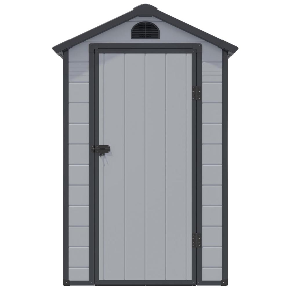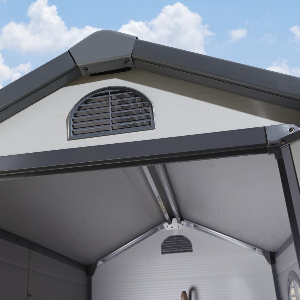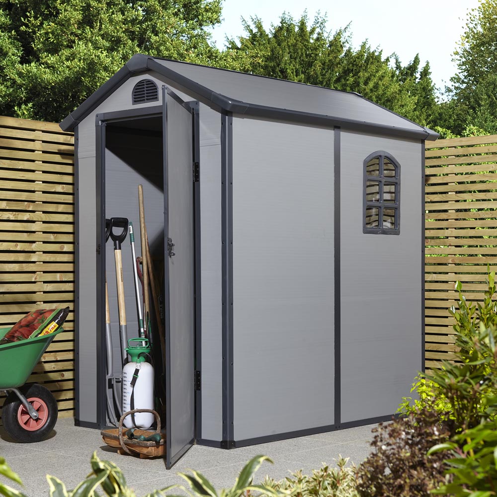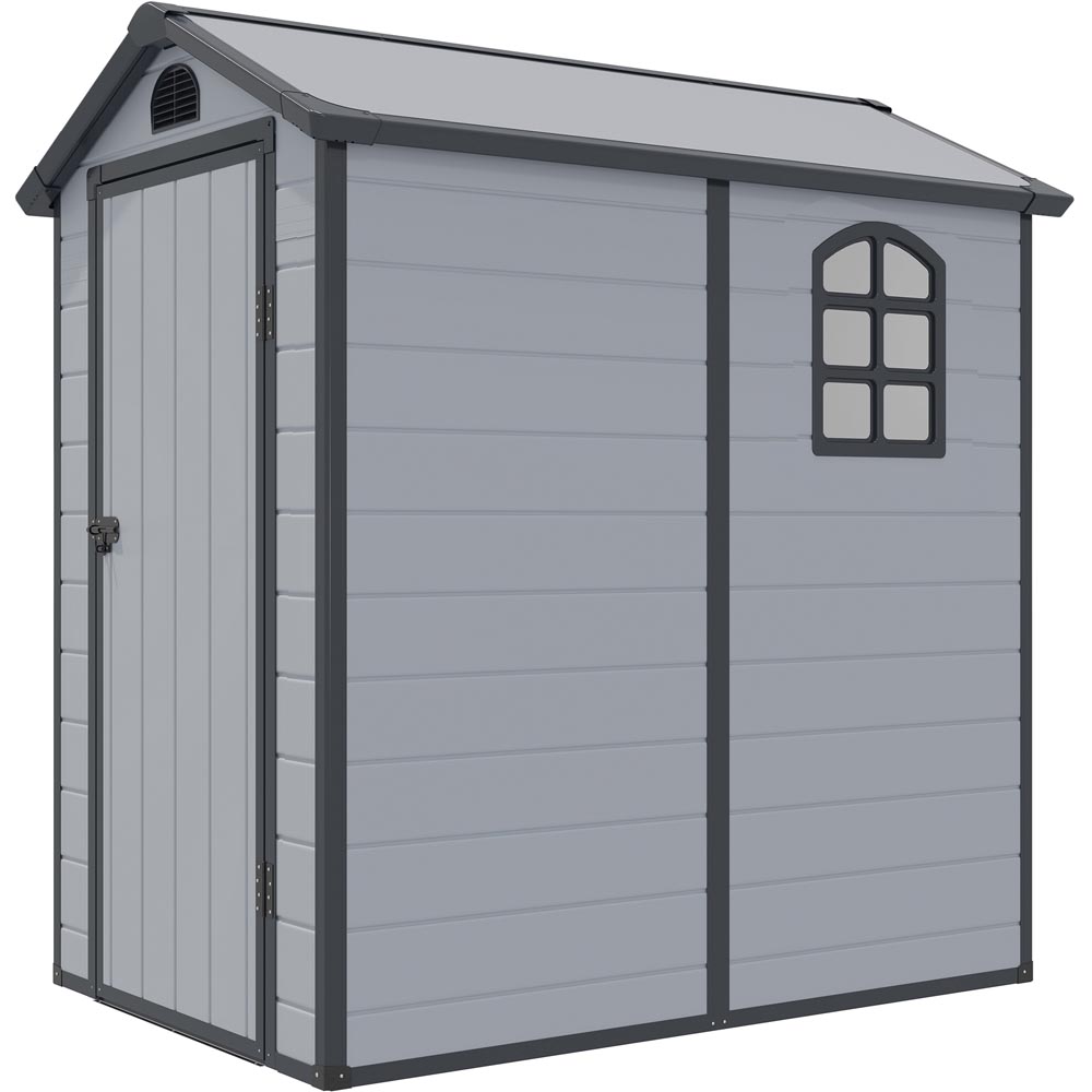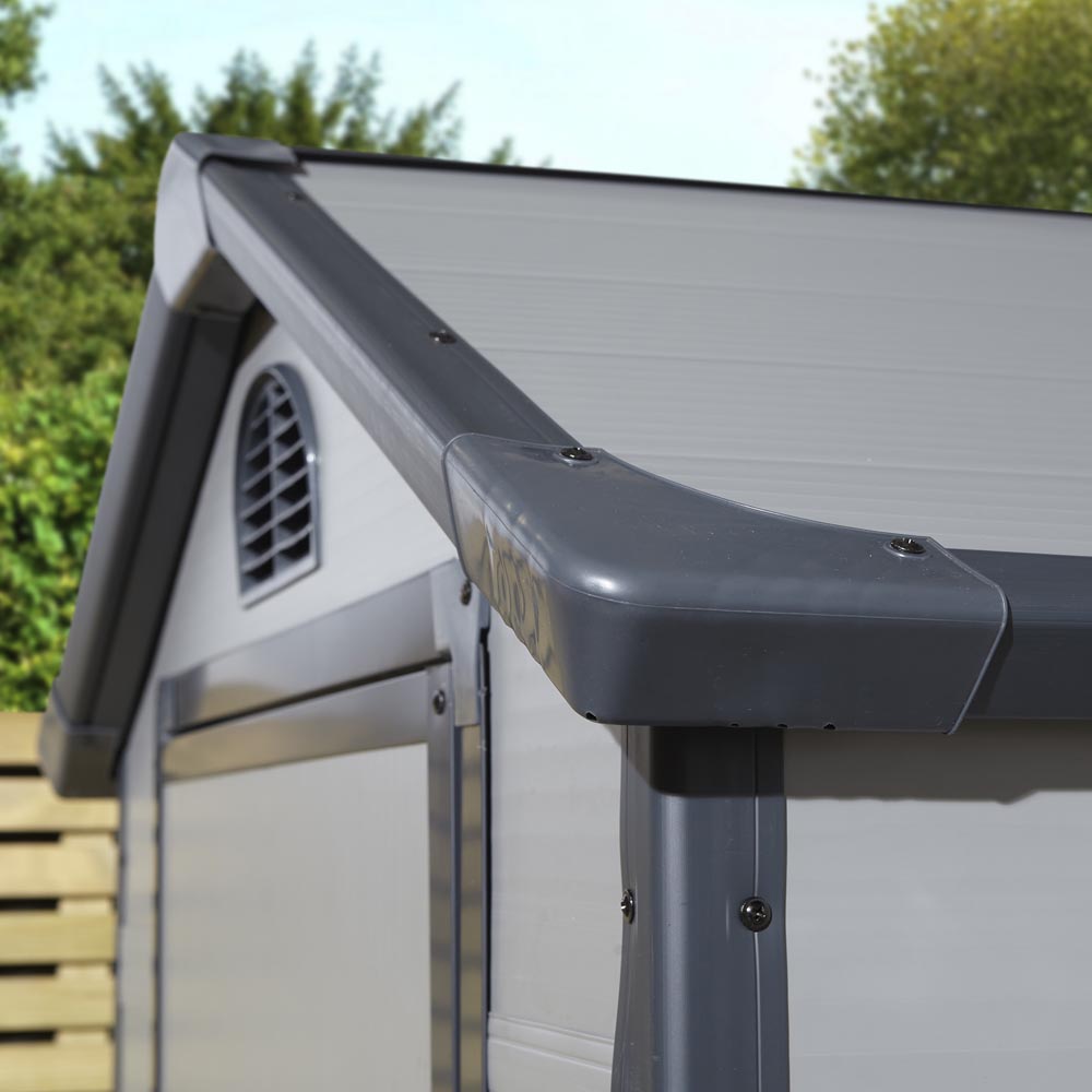 Protect your garden tools with the Rowlinson Airevale 4x6 plastic shed. This attractive, low-maintenance alternative to wooden sheds boasts lockable doors, gable vents for ventilation, and a side window for natural light. Made from 100% recycled, UV-protected polypropylene, its 12mm twin-wall fluted panel construction ensures durability and strength. The pre-painted dark grey finish with light grey trim complements any garden. Available in various sizes, this 4 x 6 foot shed is the perfect eco-friendly storage solution.