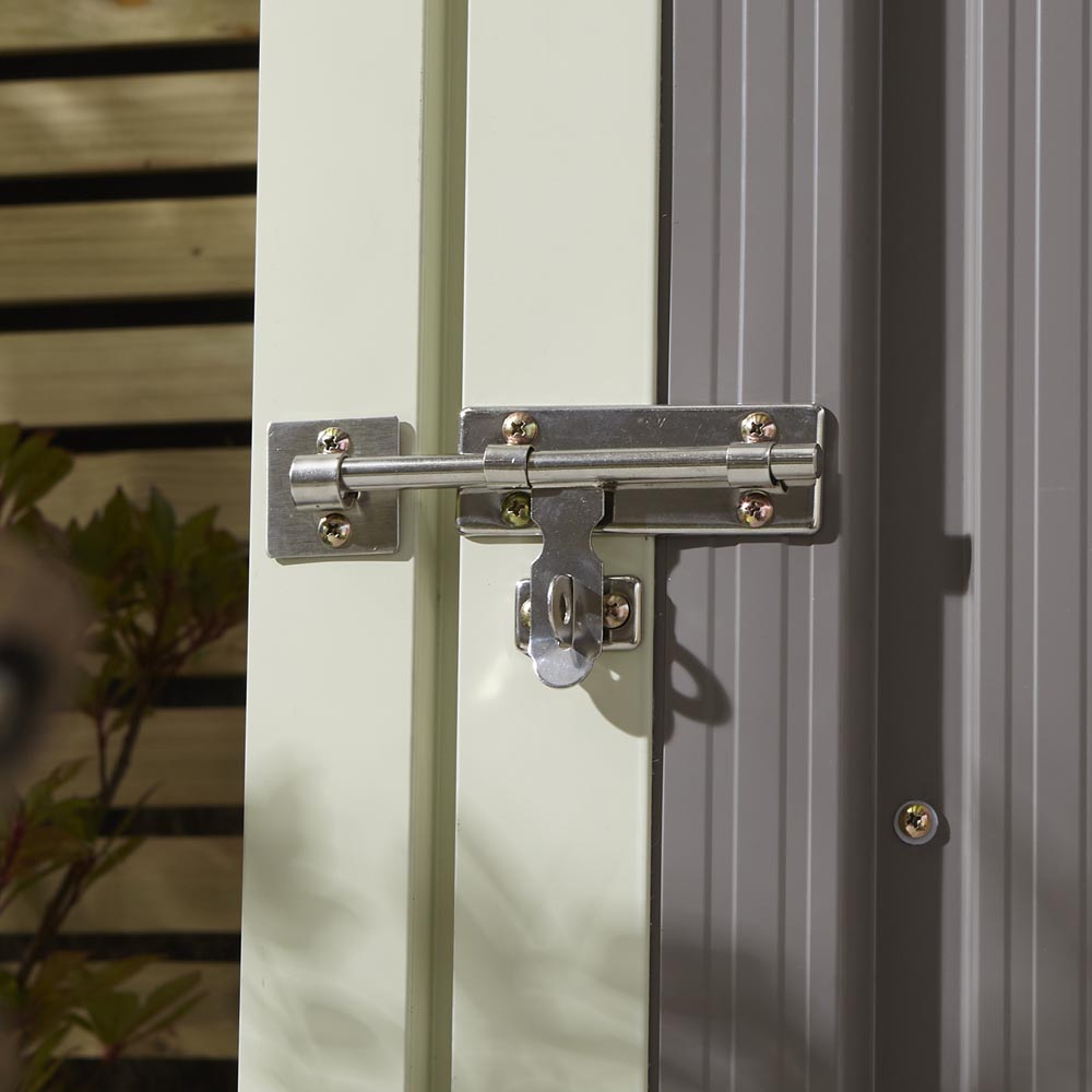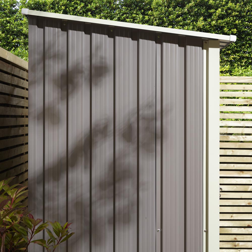 This robust Rowlinson Trentvale metal shed, measuring 5ft x 3ft, provides secure and dependable storage for your gardening tools and equipment. Unlike traditional wooden sheds, its durable metal construction requires minimal upkeep, while its attractive design complements any garden. The shed boasts a double sliding door with a lock for enhanced security and gable vents to ensure good ventilation. Inside, you'll find ample space for all your gardening needs. The fire and rot-resistant design offers superior protection for your valuable items. Finished in a stylish light grey with off-white trim, this low-maintenance shed is available in a range of sizes. The shed's metal cladding is 0.25mm thick (metal and plastic sheds only). Internal dimensions: H1810 x W1300 x D800mm. Door dimensions: H1700 x W660mm.