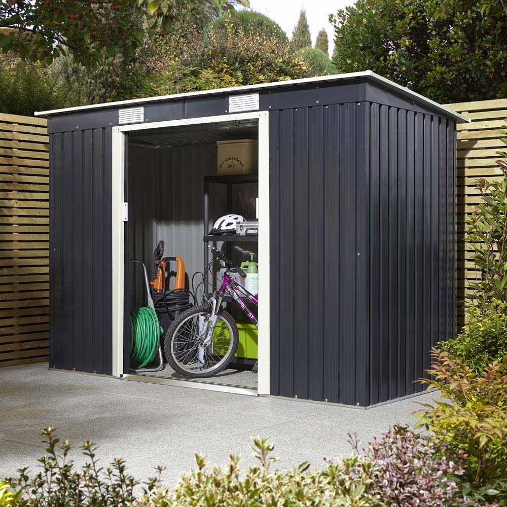 The Rowlinson Trentvale 8 x 4ft metal pent shed is a stylish and practical solution for keeping your garden tools and equipment safe and dry. This durable, low-maintenance shed offers a secure storage solution, thanks to its double sliding lockable doors. Excellent air circulation is ensured by gable vents. Fire and rot resistant, the pre-painted dark grey shed with off-white trim provides peace of mind. Inside, you'll find ample space, with internal dimensions of H1710 x W2510 x D1100mm and a door measuring H1570 x W1090mm. The cladding thickness is 0.25mm (metal + plastic sheds only). Other sizes are also available.