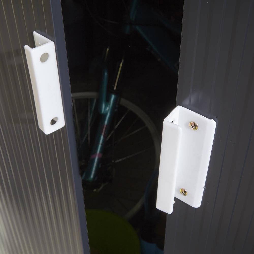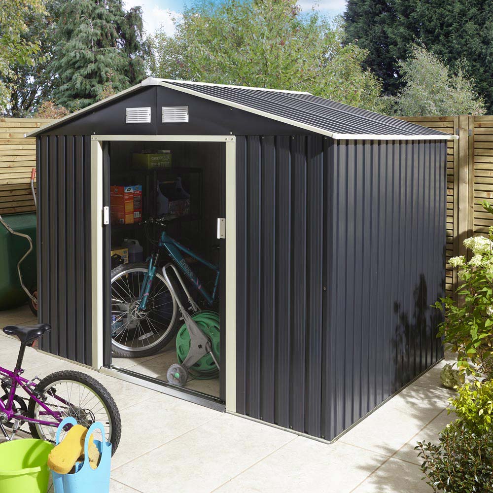 This robust Rowlinson Trentvale 8 x 6ft metal apex shed will keep your garden equipment safe and sound. A durable and low-maintenance alternative to wooden sheds, it boasts double sliding lockable doors for security and gable vents for excellent air circulation. Inside, you'll find ample space for all your gardening tools and equipment. Fire and rot-resistant, this shed provides extra peace of mind. Pre-painted in a dark grey with off-white trim, it's available in various sizes and requires minimal upkeep. Cladding thickness: 0.25mm (metal + plastic sheds only). Internal dimensions: H1880 x W2510 x D1710mm. Door: H1570 x W1090mm.