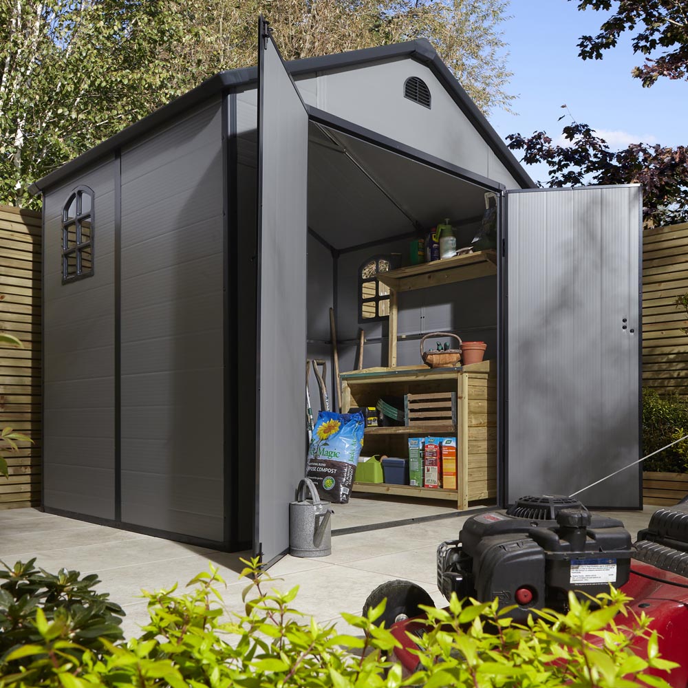 Discover the perfect way to keep your garden essentials safe and dry with the Rowlinson Airevale 8x6 Plastic Shed. This attractive and durable shed serves as a low-maintenance alternative to traditional timber structures. It features secure lockable doors and gable vents to promote excellent air circulation, complemented by two side windows that add to its functionality. Made from UV-protected Polypropylene, the shed is built with a strong 12mm twin-wall fluted panel construction, ensuring long-lasting use. Ideal for storing your gardening tools, this eco-friendly shed is made entirely from 100% recycled plastic, making it a responsible choice for your outdoor needs. Size: 8 x 6 feet.
