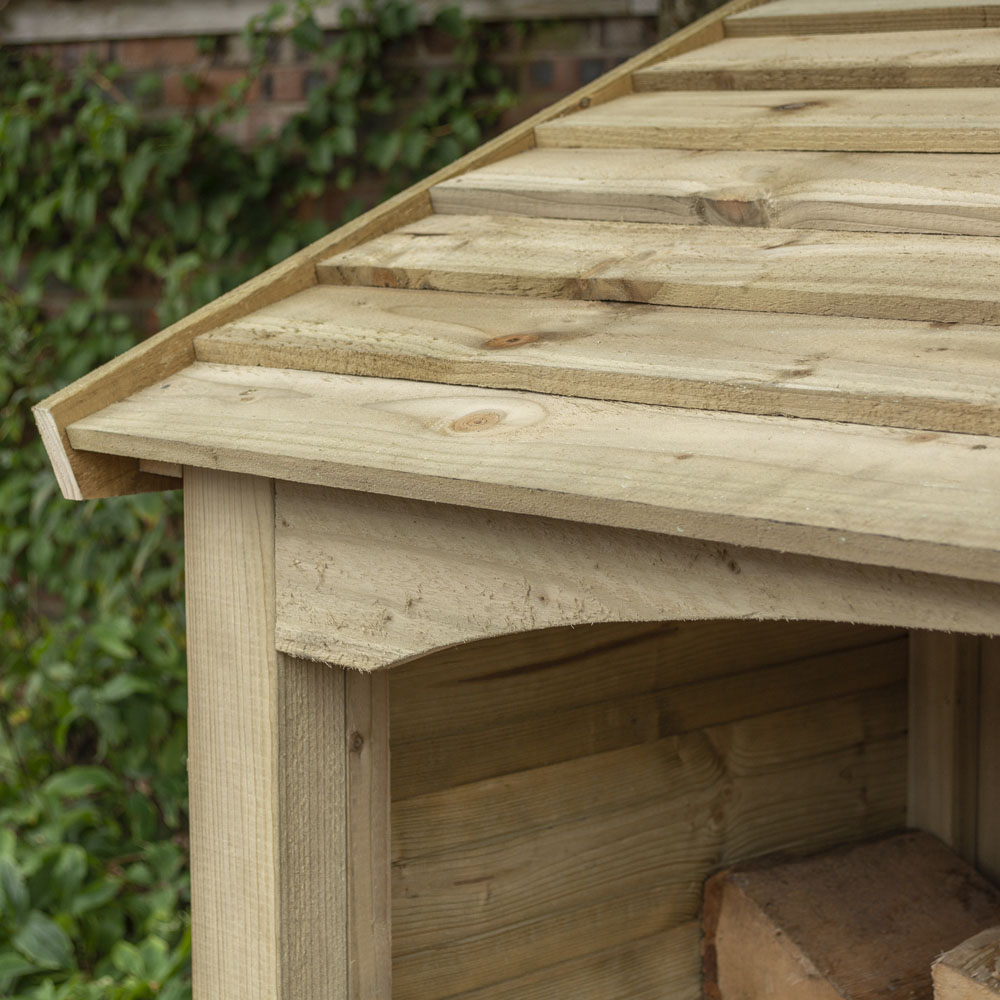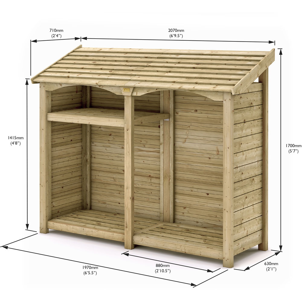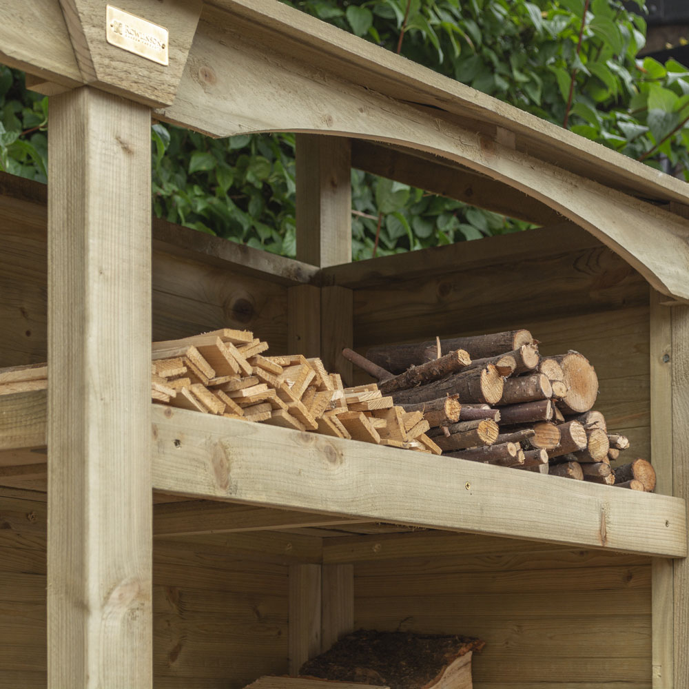 Elevate your outdoor space and keep your firewood perfectly seasoned with the Heritage Log Store. This elegantly designed store, featuring an arched fascia and finely sawn detailing, makes a stunning addition to any setting. Its spacious interior easily accommodates a double row of logs up to 270mm long (1400L capacity), ensuring you're always prepared for cosy evenings. A versatile shelf, adjustable in height and position on either side, provides convenient storage for kindling and smaller pieces. Crafted from heavy-duty, pressure-treated timber, this log store offers lasting protection against the elements, ensuring your logs remain dry and ready to burn efficiently. Ideal for log burners, fire pits, and chimineas.