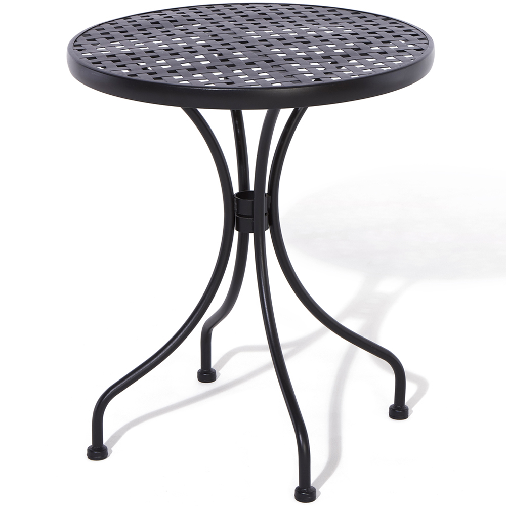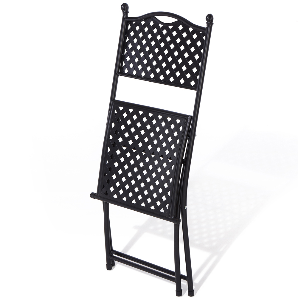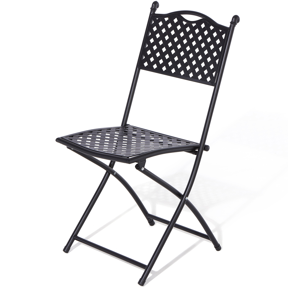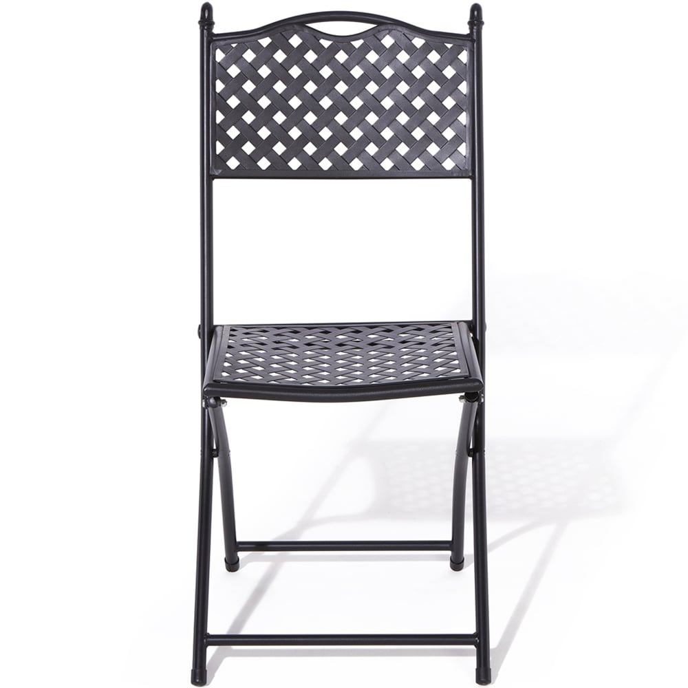 The Havana Bistro Set from Rowlinson offers an inviting spot to relax outdoors. Featuring a traditional lattice design, this bistro set is crafted with a strong steel frame and finished with a stylish, matt black powder coating. The set includes two folding chairs for convenient storage and portability.