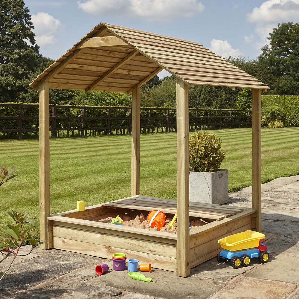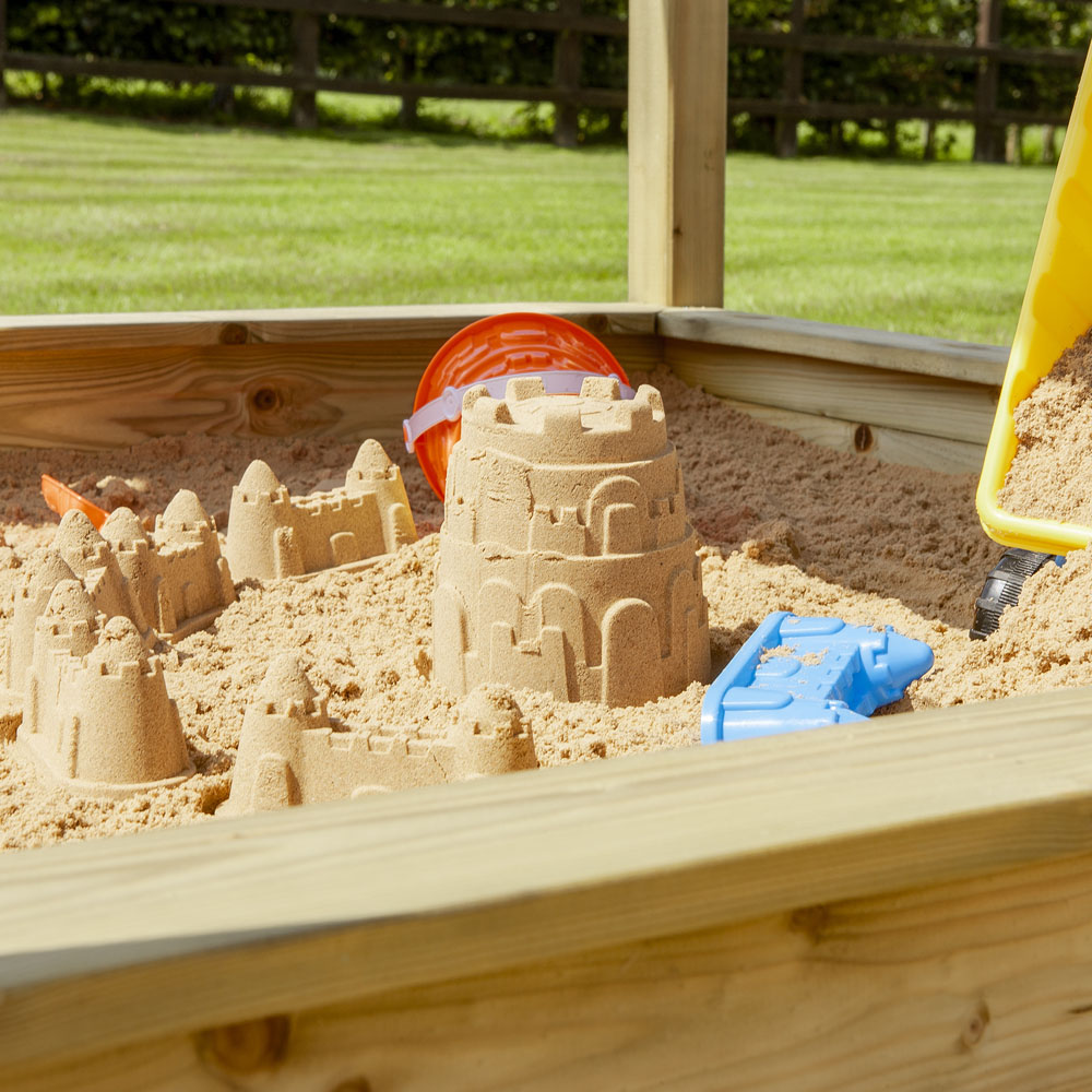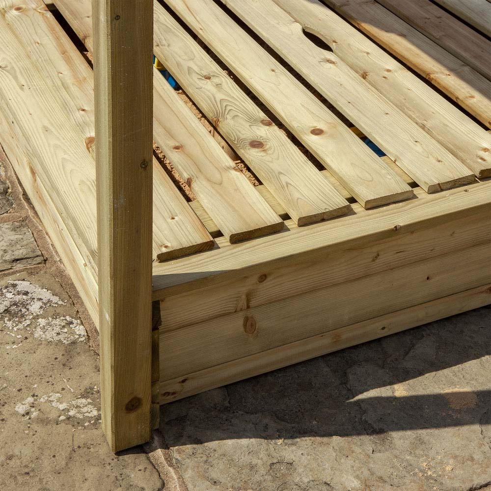 Create a magical play space in your garden with the Rowlinson Parkland Sandpit and its delightful apex roof. This charming sandpit keeps sand dry and clean thanks to its protective lid, which also deters unwanted creatures. Built from pressure-treated timber to resist rot, it offers lasting durability and has a capacity of approximately 233L. Overall dimensions: H165 x W134 x D134cm.