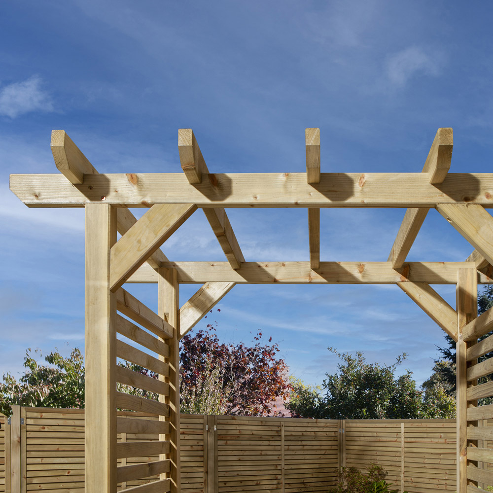 Add instant charm to your outdoor space with the Rowlinson Stapeley Wooden Arch. This contemporary garden arch boasts horizontal slatted side panels and an attractive pergola roof, perfect for showcasing your climbing plants. Pressure-treated for a long lifespan, its natural timber finish lets you customize the look to match your garden's style.