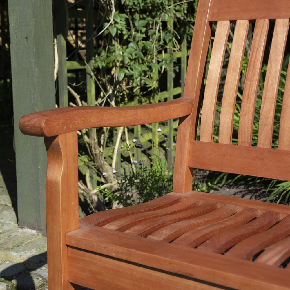 Enjoy lasting comfort and style with this eucalyptus hardwood bench. Its classic slatted design and rich dark brown stain will enhance any garden or patio. Built for durability to withstand harsh weather, this bench comfortably seats two, thanks to its ergonomically designed seat, backrest, and armrests. Easy self-assembly is needed. The dimensions are H86.4 x W121.9 x D71.1cm and it comes with a one-year guarantee.