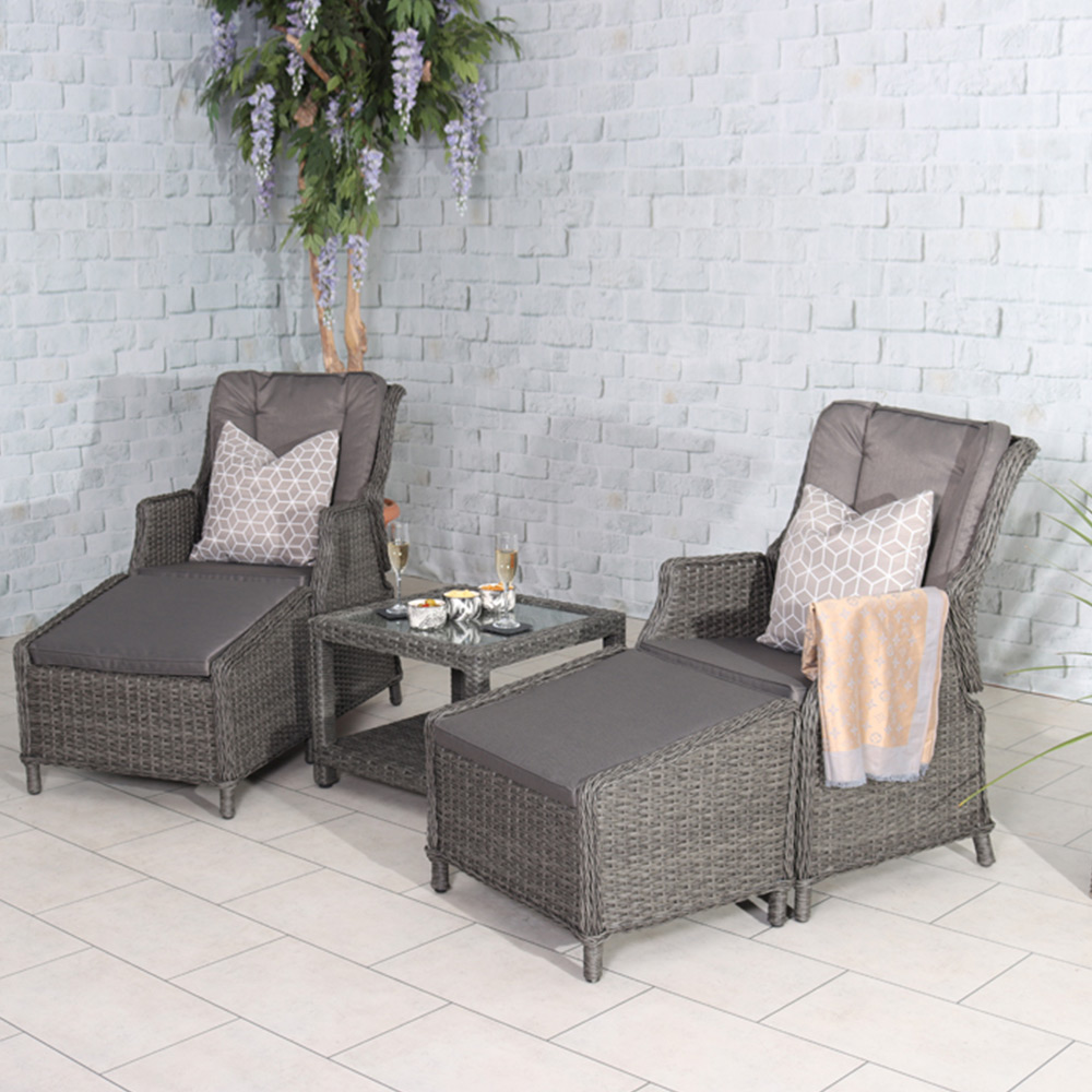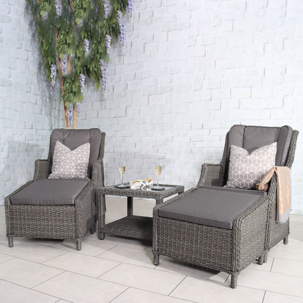 Unwind al fresco in style with the Royalcraft Paris Deluxe Gas Reclining Relaxer Set. This timeless design, crafted from an aluminium frame and hand-woven synthetic rattan, combines enduring strength with a classic aesthetic. The set includes a tempered glass top table and two gas-operated recliners, complete with footstools, cushions for the seat and back, and weather-resistant cushions. Perfect for afternoon drinks or dinner parties, this set is built to withstand the elements. Stain-resistant and water-resistant, the cushions are designed for lasting comfort. Durable waterproof covers are available for added protection. Explore our comprehensive range of garden furniture covers to find the perfect fit.