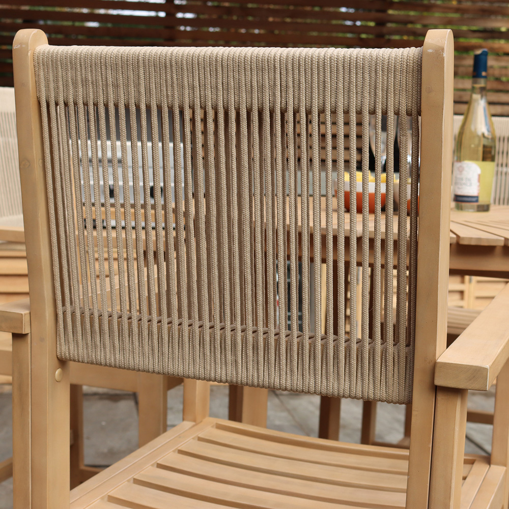 Enhance your outdoor entertaining with the Roma Bar Set, a stunning addition crafted from 100% FSC-certified Acacia hardwood. This durable set boasts a protective PU coating for lasting beauty and practicality. The set includes a round table and four fixed chairs, all elegantly accented with a contemporary synthetic rope weave. Galvanised fittings provide superior rust protection, while the 6mm beige polyester rope adds a touch of refined style. This bar set seamlessly blends stylish design with enduring functionality. For extended protection, explore our range of heavy-duty garden furniture covers to ensure your set remains in pristine condition for years to come.
