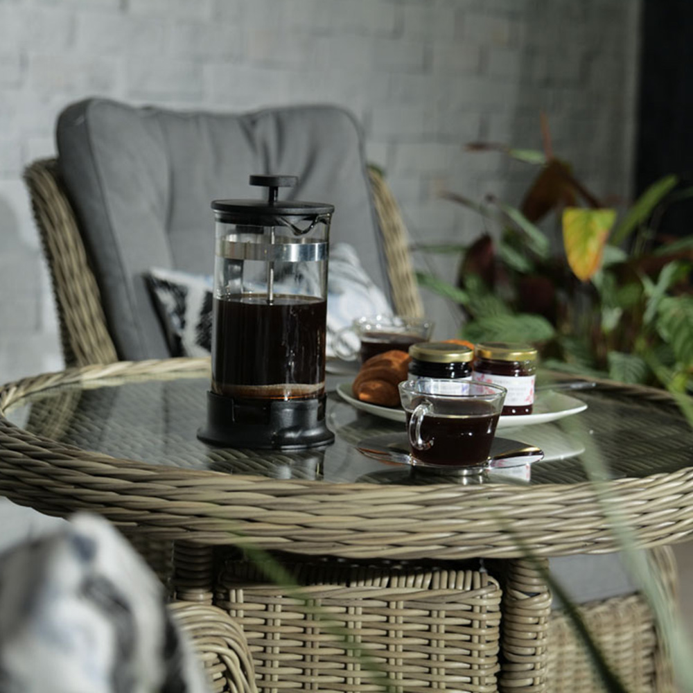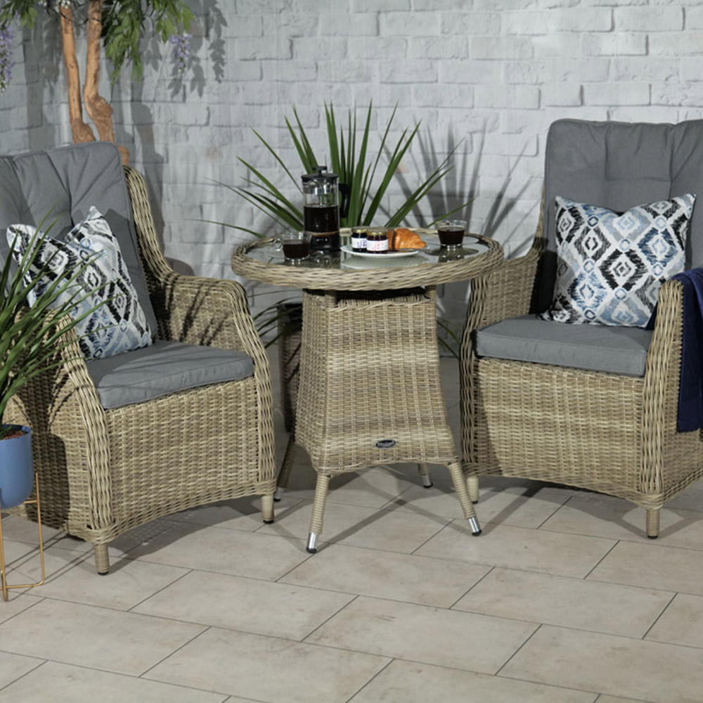 Transform your outdoor area with the Royalcraft Wentworth two-seater high back comfort set, perfectly designed to enhance any patio or decking space. This charming bistro set provides a wonderful al-fresco dining experience, featuring a timeless design that remains stylish year after year. Constructed with a sturdy aluminium framework and beautifully hand-woven synthetic half-round rattan, it combines elegance with strength and durability. The set includes a chic tempered glass top table with a parasol hole and two high back comfort chairs, both outfitted with comfortable seat and back cushions. It’s the perfect setting for enjoying drinks or dinner in the inviting afternoon sun. To protect your investment, the set comes with a one-year manufacturer’s warranty. The table dimensions are H74 x W70 x D70cm, while the high back comfort chairs measure H95 x W62 x D77cm. For extended product life, utilize a protective furniture cover during the autumn and winter months, as well as in inclement weather. We also recommend storing the cushions in a clean, dry place when not in use, and consulting the care instructions for specific cleaning recommendations.