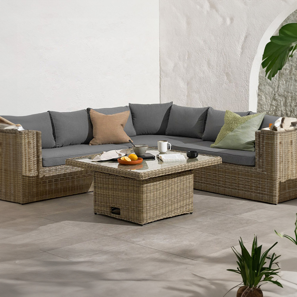 Elevate your outdoor living with the exquisite Royalcraft Wentworth Rattan four-piece corner lounging set. Perfectly suited for both formal dining and casual gatherings, this lounge set enhances any garden, patio, or conservatory setting. Its strong aluminium framework paired with hand-woven synthetic half-round weave rattan delivers a sophisticated blend of style, comfort, and resilience. This set includes a 100 x 100cm square adjustable table, two sofas, and a corner seat, all featuring comfortable cushions. The rustproof aluminium construction guarantees durability, while the adjustable table offers versatility, allowing you to easily raise it for dining or lower it for a cosy coffee table setting. The cushions are resistant to both shower and stains, making this lounging set ideal for indoor and outdoor enjoyment. Ensure your furniture remains in pristine condition with our collection of durable and waterproof garden furniture covers.