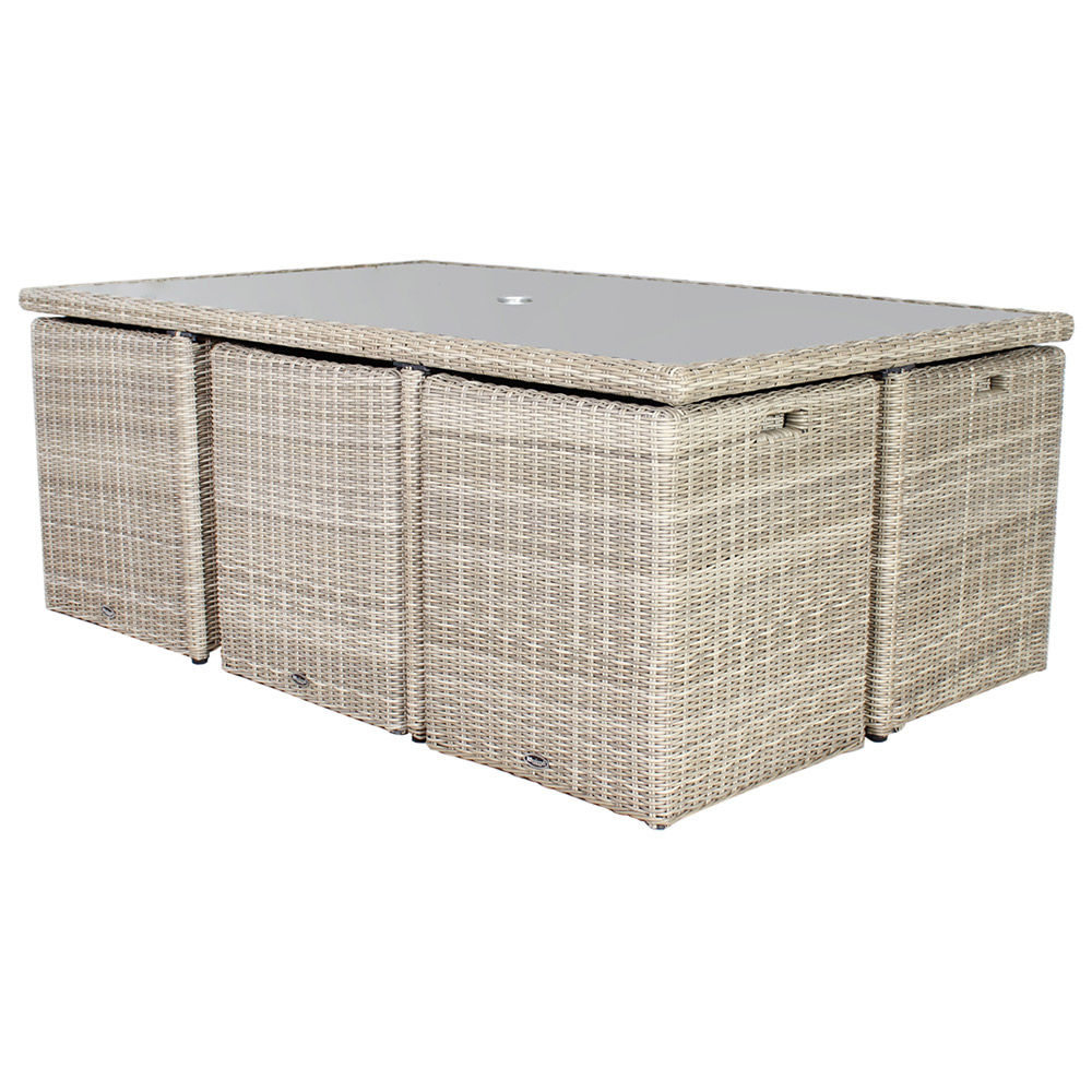 Elevate your outdoor entertaining experience with the Royalcraft Wentworth ten-seater cube set. This exquisite dining set seamlessly blends timeless elegance with practical functionality, making it an ideal addition to any patio or garden space. Crafted with a rustproof aluminium framework and hand-woven, synthetic half-round rattan, it promises not only style but also exceptional comfort and durability. The centrepiece is a generous 195 x 125cm rectangular table, adorned with a tempered glass top featuring a convenient parasol hole. Accompanying the table are six cube chairs, designed with folding backrests for added versatility, along with four footstools that tuck away neatly inside the chairs, ensuring a clutter-free environment. To enhance your seating comfort, 16 shower and stain-resistant cushions are included, perfect for those sun-soaked gatherings. With a clever cubic design, this set effortlessly stores away, occupying minimal space when not in use. It comes complete with a one-year manufacturer’s warranty for peace of mind. The table measures H75 x W195 x D125cm, while the chairs are H68 x W58 x D58cm, and the footstools are H46 x W45 x D45cm. For optimal longevity and appearance, we recommend using a protective cover during autumn and winter months, as well as in adverse weather conditions. When not in use, store the cushions in a clean, dry place to maintain their quality. Refer to the care instructions on the cushions for specific cleaning guidance. Protect your garden furniture with our durable and waterproof covers. Explore our wide range of heavy-duty Garden Furniture covers to find the perfect fit for your needs.