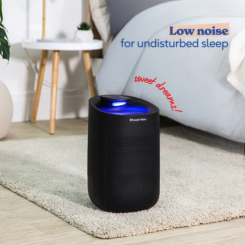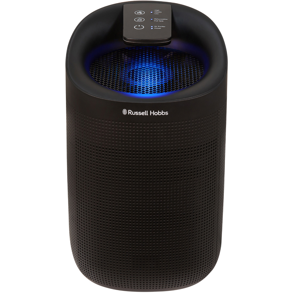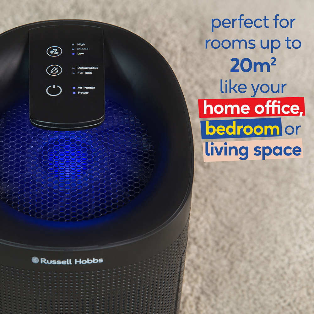 Enjoy fresher air without the hefty price tag. The Russell Hobbs Fresh Air Pro Compact Dehumidifier and Air Purifier is perfect for keeping your home office, utility room, or living area comfortable and healthy. Ideal for rooms up to 20m², this 1L model tackles humidity, dampness, and condensation with ease. It boasts an advanced H13 HEPA filter, capturing 99.95% of airborne particles for cleaner, healthier breathing. Ozone-free for peace of mind, it features a user-friendly touch control panel, LED lighting, 3-speed settings, and a whisper-quiet low noise function. Weighing only 2.8kg, it's easily moved between rooms. With a maximum extraction rate of 750ml per day and an auto cut-off function, it's designed for convenience. A defrost function prevents issues in colder temperatures. This model comes with a one-year manufacturer guarantee, extendable to two years upon registration.