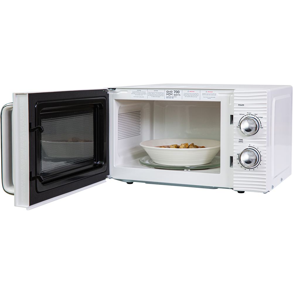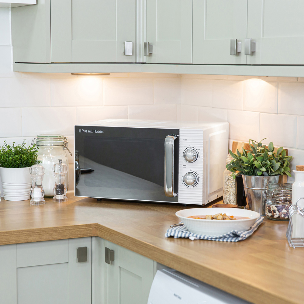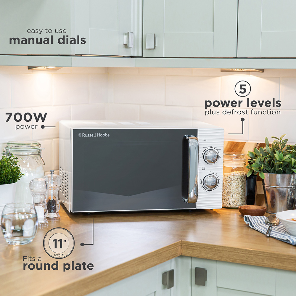 Whip up your favourite meals in moments with the Russell Hobbs Inspire RHM1731 White 17L Microwave. Boasting a stylish mirror door finish, this 700W microwave offers five power settings to suit your cooking needs. Defrosting is a breeze too, letting you cook straight from frozen. With a 17L capacity, it easily accommodates an 11-inch dinner plate. The 24.5cm removable glass turntable is dishwasher-safe for simple cleaning. Just turn the dials to select your desired power level and cooking time. Plus, the internal light and handy ringer function keep you informed while your food is cooking.