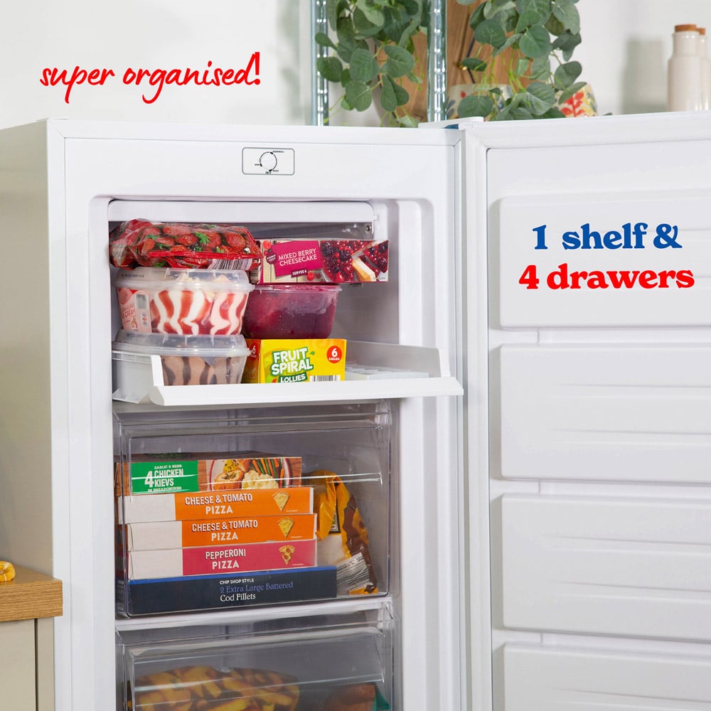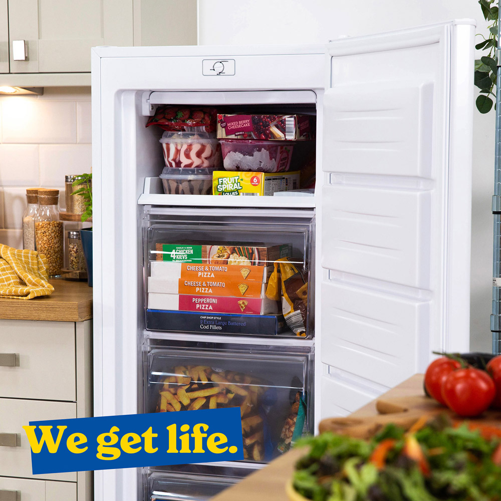 This Russell Hobbs Freestanding Freezer is the perfect addition to any household in need of extra space. Ideal for your kitchen, garage or utility room, it can be used as your main freezer or as some extra space when you need to stock up. With 168L of space, this model can easily fit up to nine bags of food shopping, providing you with plenty of storage for batch-cooked meals or frozen treats. And with 4 handy drawers and a drop-down freezer flap compartment, it’s super easy to keep your food organised. Thanks to our Winter Shield technology, you can place your freezer in your garage or outbuilding. This technology ensures your freezer performs properly and keeps your food frozen even in temperatures as low as -15°C. This freezer also features an adjustable thermostat, a reversible door for versatility and adjustable feet to ensure your freezer is stable on uneven surfaces, perfect for your garage or outbuilding. For added peace of mind, this freezer comes with a 1-Year Guarantee, plus an extra year upon registration. This way, in the unlikely event something goes wrong, you know we'll always be on hand to help.