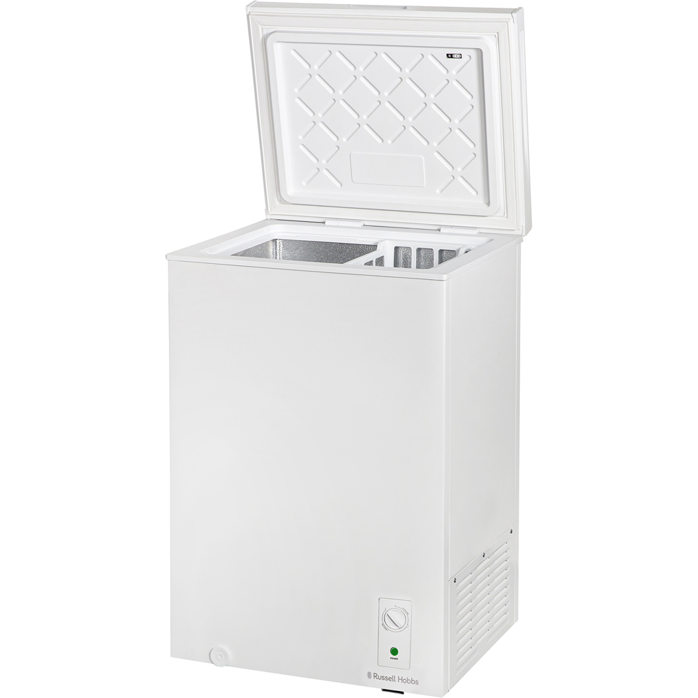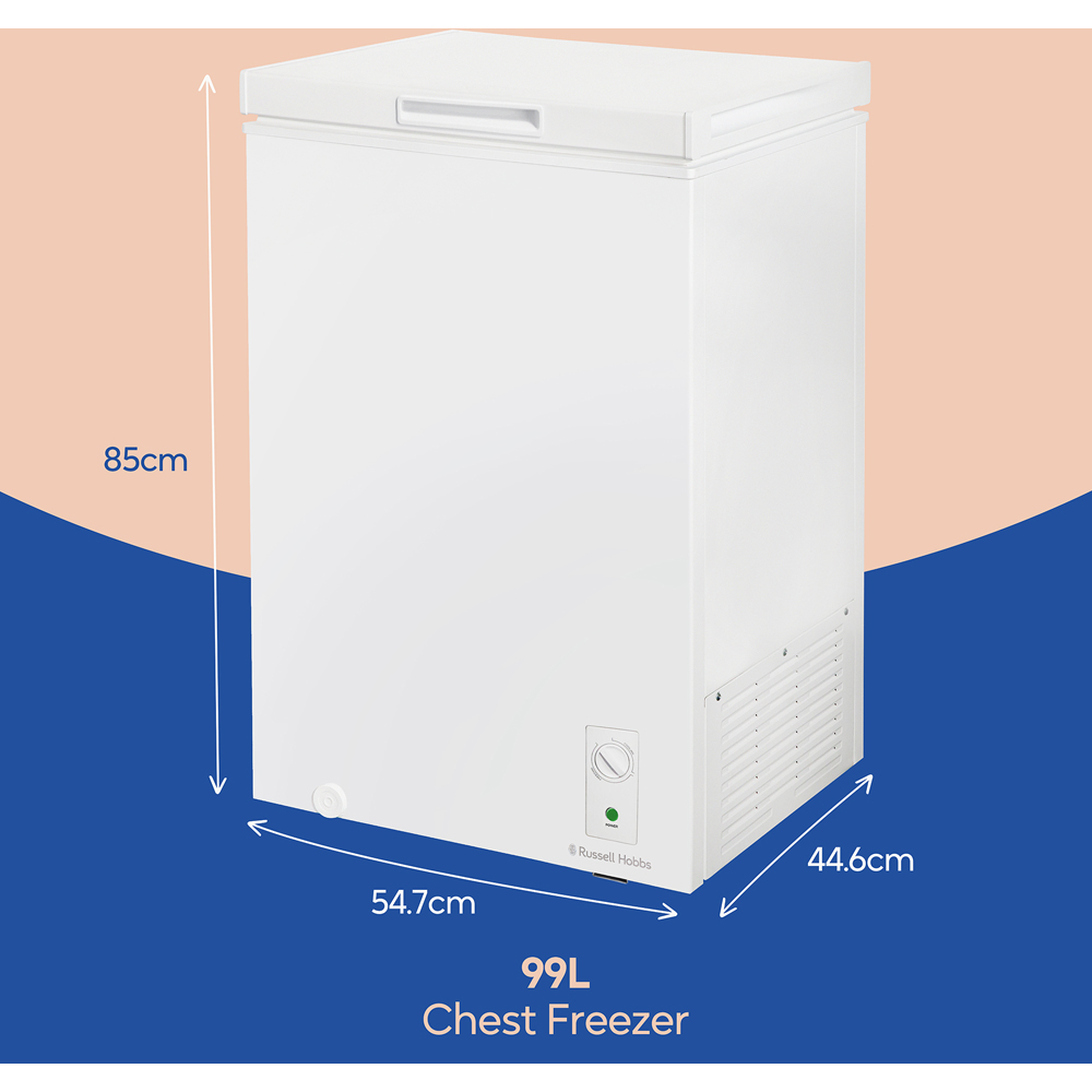 This Russell Hobbs compact chest freezer is perfect if you need extra freezer space, but short on space in your home. With an impressive 99L of storage, you can easily free up some room in your main freezer. This freezer is suitable for your garage, outhouse or shed, keeping it out of your main kitchen space. Thanks to the spacious interior with a handy basket, this freezer can fit five bags of shopping. Keep your family's favourite batch-cooked meals and frozen treats handy without worrying about running out of room. Plus, with the handy chill or freeze function you can effortlessly switch to chill mode if you need the space to keep your extra drinks or snacks cool. For added peace of mind, this Russell Hobbs chest freezer comes with a 1-Year Guarantee, plus an extra 4 years upon registration. This way, in the unlikely event something goes wrong, you know we'll always be on hand to help.