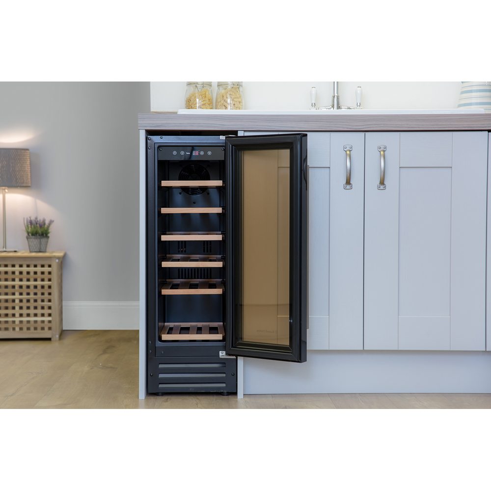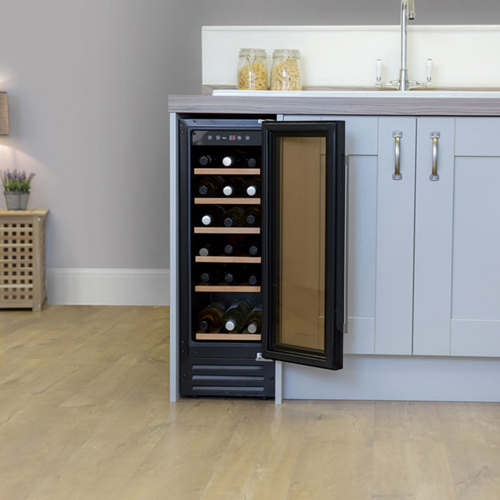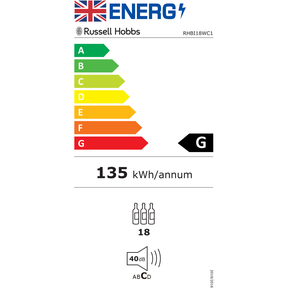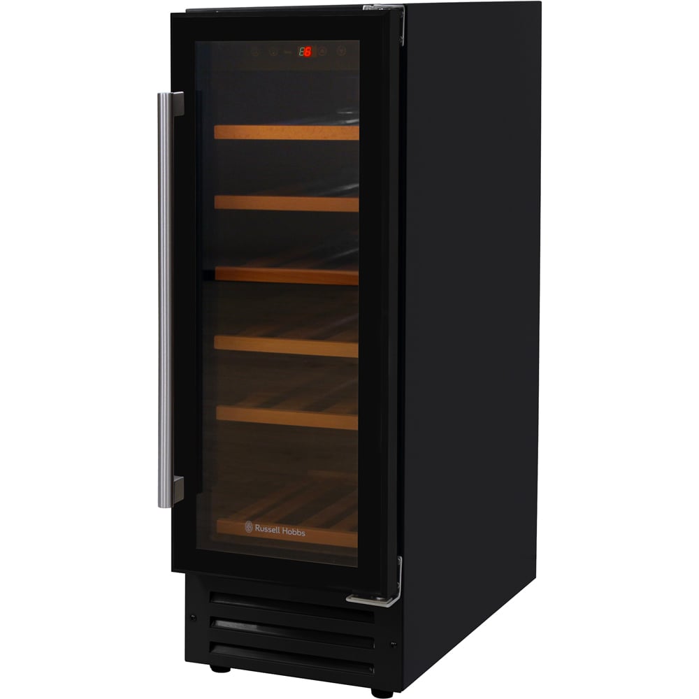 This Russell Hobbs wine cooler has a sleek design, it can be freestanding or built in making it a truly flexible appliance. The black exterior on the RHBI8WC1 looks modern and stylish whilst the reversible door and adjustable feet ensure that this wine cooler would fit perfectly in your home no matter the style or layout. The wine cooler has a 58 litre capacity, allowing you to store up to 18 bottles of wine. The 6 wood shelves store three bottles per shelf, for easy organisation. This black wine cooler has a B grade energy efficiency rating and LED display, so you can save on your energy costs. This wine cooler has a temperature range from 5° - 18° and an LED temperature control so you can easily set the temperature to best suit you, keeping your wine bottles perfect. This versatile wine cooler has a low 39dB(A) noise production so is suitable for any area of your home.