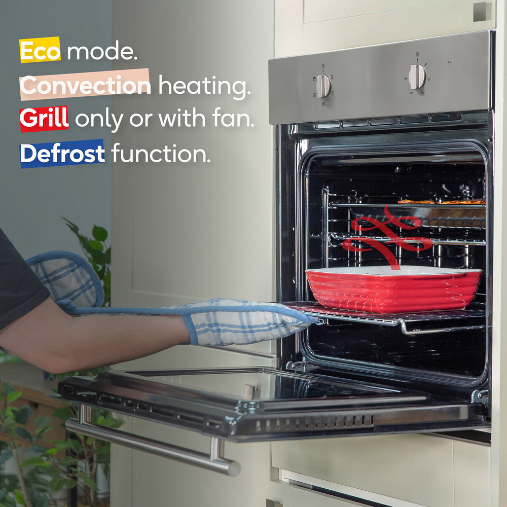 This Russell Hobbs Built-In Electric Fan Oven has a sleek design that will complement any kitchen. The single cavity with an impressive 70L capacity and five oven functions make this oven perfect for all your family's cooking needs. Offering full flexibility you can choose from convection heating, eco, grill with fan, grill only and even a defrost function. The handy eco mode saves energy as the fan distributes the heated air around the food from the top and rear heating elements. With the two shelves, you can effortlessly cook a variety of meals at once plus, the dials are super easy to use. The oven light means that you can check on the progress of your cooking without opening the oven door and even better, the easy clean interior will keep your oven looking newer for longer. For added peace of mind, this Russell Hobbs Electric Oven comes with a 1-year guarantee with a free second year guarantee upon registration.