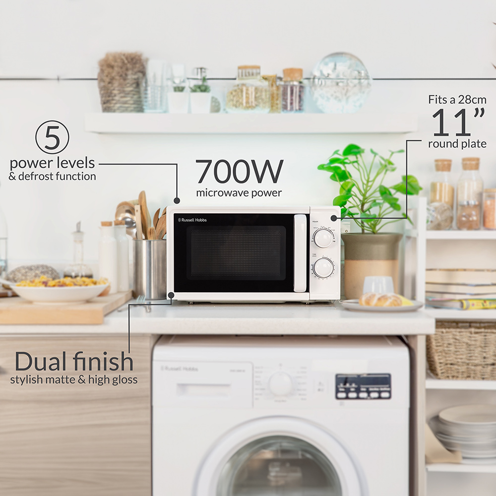Simple to use, this compact 700-watt microwave provides you with quick and convenient cooking. It accommodates a round dinner plate up to 11 inches (28cm). Tailor the cooking to suit your recipe with the five power levels, selected via the power dial. There’s also a defrost setting to save you time when heating meals straight from the freezer.