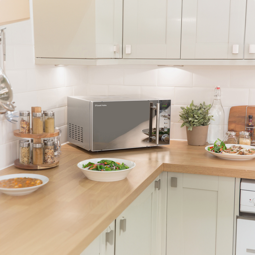 Russell Hobbs microwave ovens are affordable, stylish, and fantastic for getting you through the weekly meal prep. Cooking is always really easy with this model, no matter what you're making for dinner. This 20L digital microwave has a sleek, mirrored door finish and boasts 800W of power with five power settings, so you can cook exactly how you like. It also features an automatic defrost setting; simply input the food's weight, and the microwave selects the ideal defrost time. The handy digital clock and countdown timer add to the convenience. With a 20L internal volume, it easily accommodates a standard-size dinner plate. For easy cleaning, it has a removable, dishwasher-safe glass turntable, plus pre-programmed auto-cook menus for effortlessly preparing your favourite meals. For added safety, this microwave includes a child safety lock option which locks the button control to prevent accidental activation.