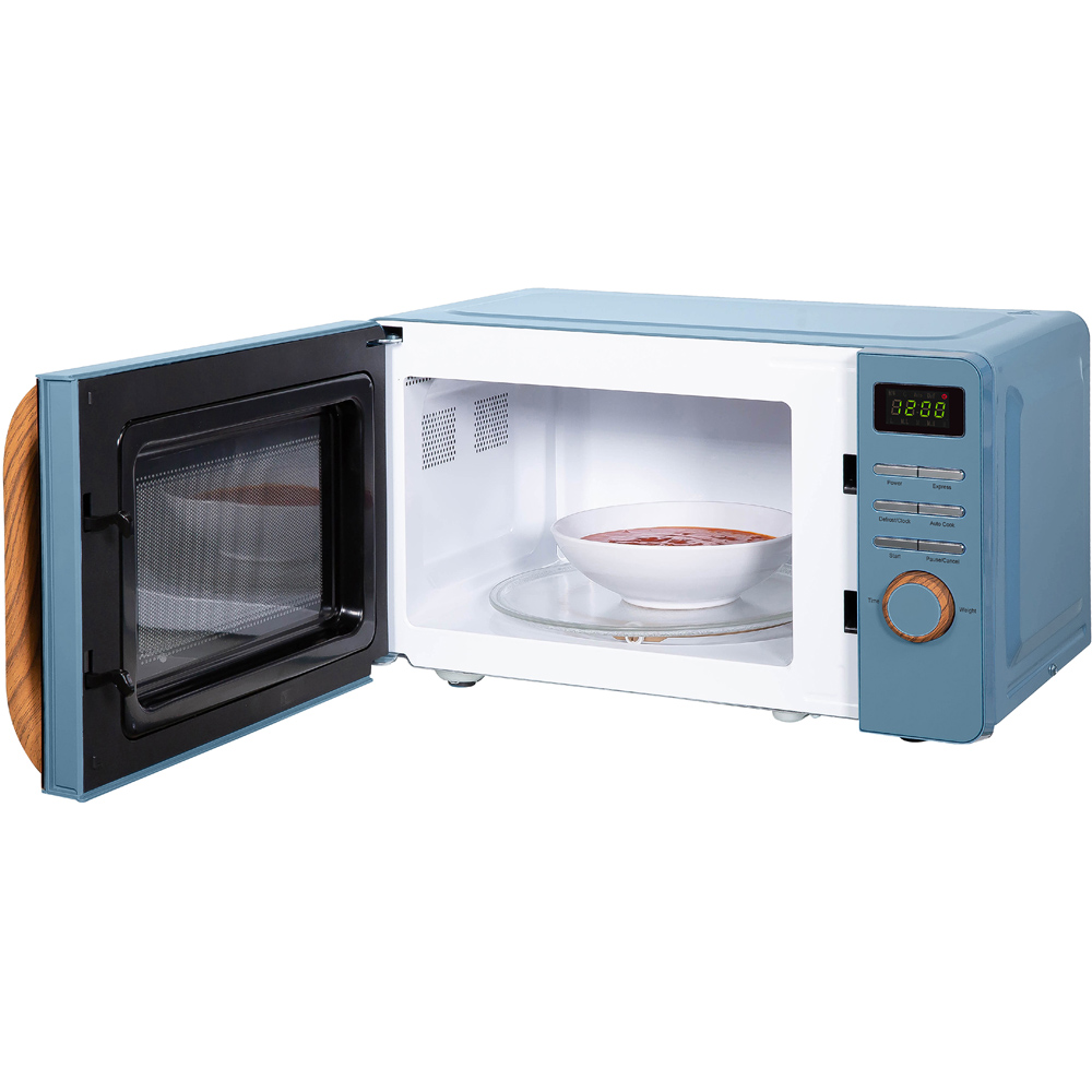 The Russell Hobbs RHMD714BL-MN Blue 17L Scandi Compact Digital Microwave 700W brings a touch of Scandinavian style to any kitchen. Its sleek design features natural wood effect accents, adding a sophisticated look to your cooking space. Ideal for smaller kitchens, this microwave offers a 17L capacity, easily accommodating a 10.5 inch (26.5cm) dinner plate.