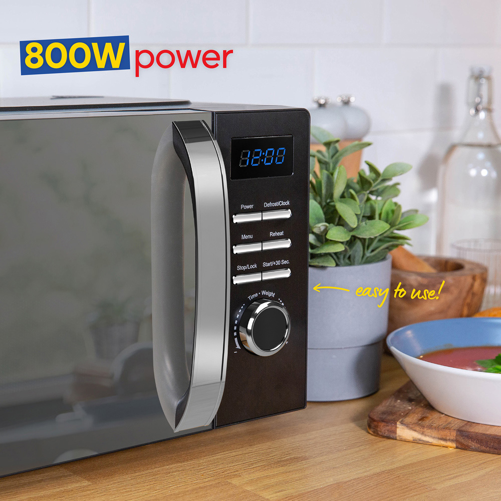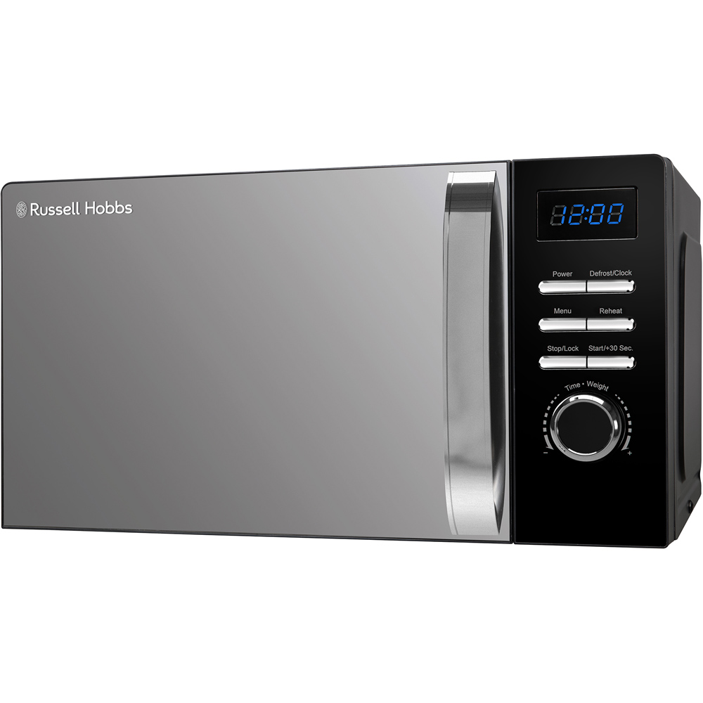 The Russell Hobbs 20L Digital Microwave is a stylish and practical addition to any kitchen, making meal preparation a breeze. Finished in matt black with elegant accents and a mirrored door, this 800W microwave combines good looks with everyday functionality. With a generous 20L capacity that easily accommodates a 10.5-inch plate, it's perfect for all family sizes.