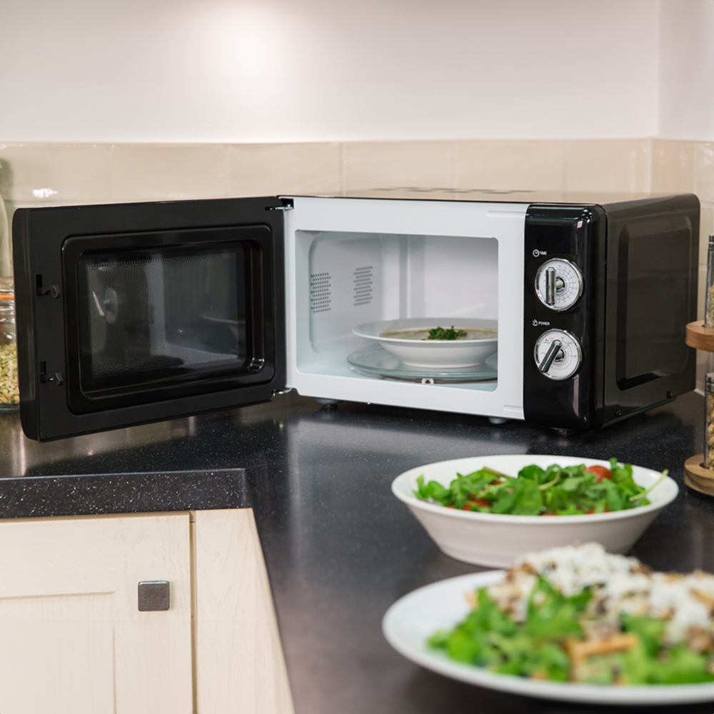 The Russell Hobbs RHRETMM705B-N Black 17L Compact Retro Solo Manual Microwave 700W is affordable, stylish and great for getting you through the weekly meal prep. This appliance is sure to add a sophisticated retro touch to your kitchen with its sleek curves, streamlined chrome handles and glossy black finish. With a 17L capacity and 700W of power, this microwave is ideal for quick and convenient cooking at home. It features five microwave power levels and a defrost setting, allowing you to tailor the cooking to suit your recipe. Simply turn the power dial to select your desired level. It easily fits a round dinner plate up to 10.5 inches (26.5cm) and is easy to use. It also comes with a one-year guarantee. So whatever you're making the family for dinner, cooking is always really easy with this model.