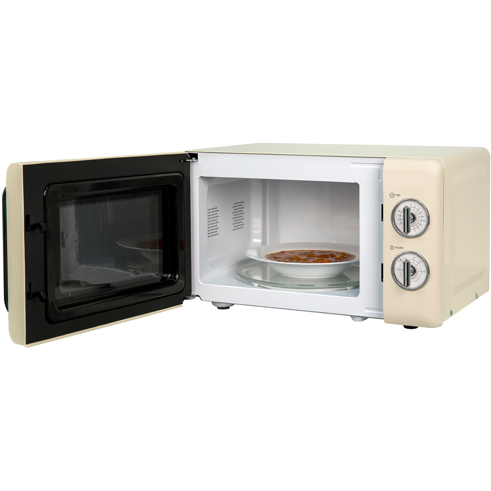 Introduce a touch of vintage charm to your kitchen with the Russell Hobbs RHRETMM705C-N Retro Cream Microwave. Its elegant design, complete with smooth curves, chrome accents, and a cream finish, ensures it will stand out. Perfect for easy everyday cooking, this microwave has a 17-litre capacity and 700W of power. With five power levels and a useful defrost setting, you can easily adjust the settings to match your needs. Simply use the power dial to select the perfect level. Designed to accommodate a 10.5-inch (26.5cm) round dinner plate, this microwave is both practical and user-friendly. It also comes with a one-year guarantee for peace of mind.