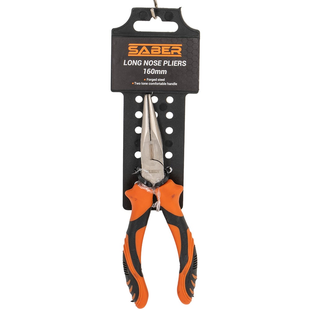 Engineered for precision, the Saber 16cm Long Nose Pliers feature a slim, elongated tool head, ideal for intricate electrical work. Made from forged steel with a nickel alloy coating, they provide durability while allowing for effortless bending, repositioning, and wire cutting. Featuring rubber soft-grip handles, these pliers ensure comfort even during extended use.