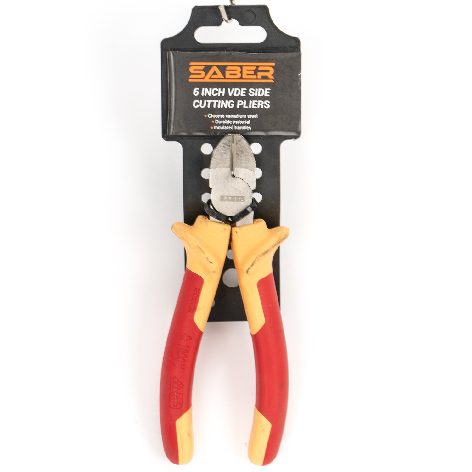 Stay safe and precise with Saber Side Cutting Pliers, designed for working around live currents with confidence. Tested up to 10,000V AC, they feature durable chrome vanadium steel jaws for efficient stripping and snipping. The ergonomically designed insulated handles offer maximum comfort and a secure grip, making them a must-have tool for electrical work.