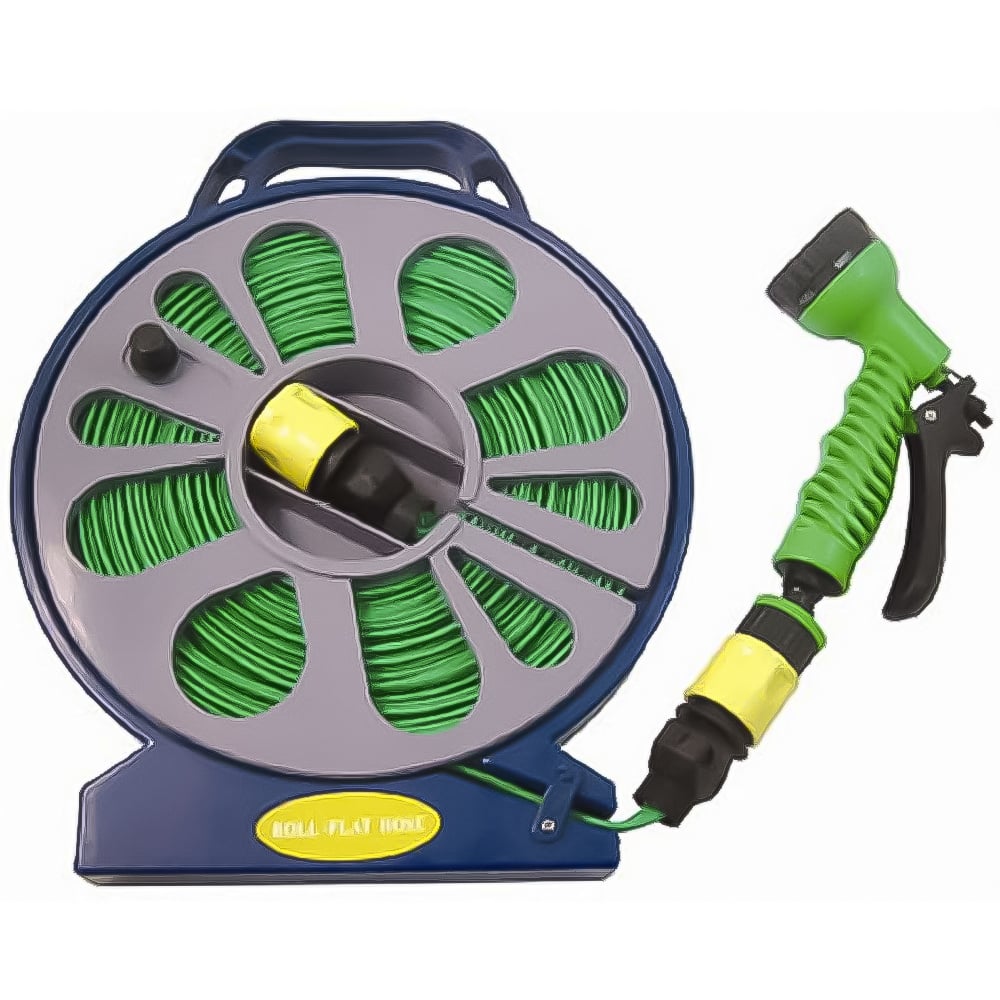 Effortlessly water your garden with the Samuel Alexander 15m Flat Garden Hose. This practical set includes a 15-metre hose and a versatile spray nozzle, offering convenient watering control. The hose',s tight weave and easy-wind-up reel with integrated stand ensure compact storage. The spray gun boasts a comfortable handle and seven spray settings for precise watering.