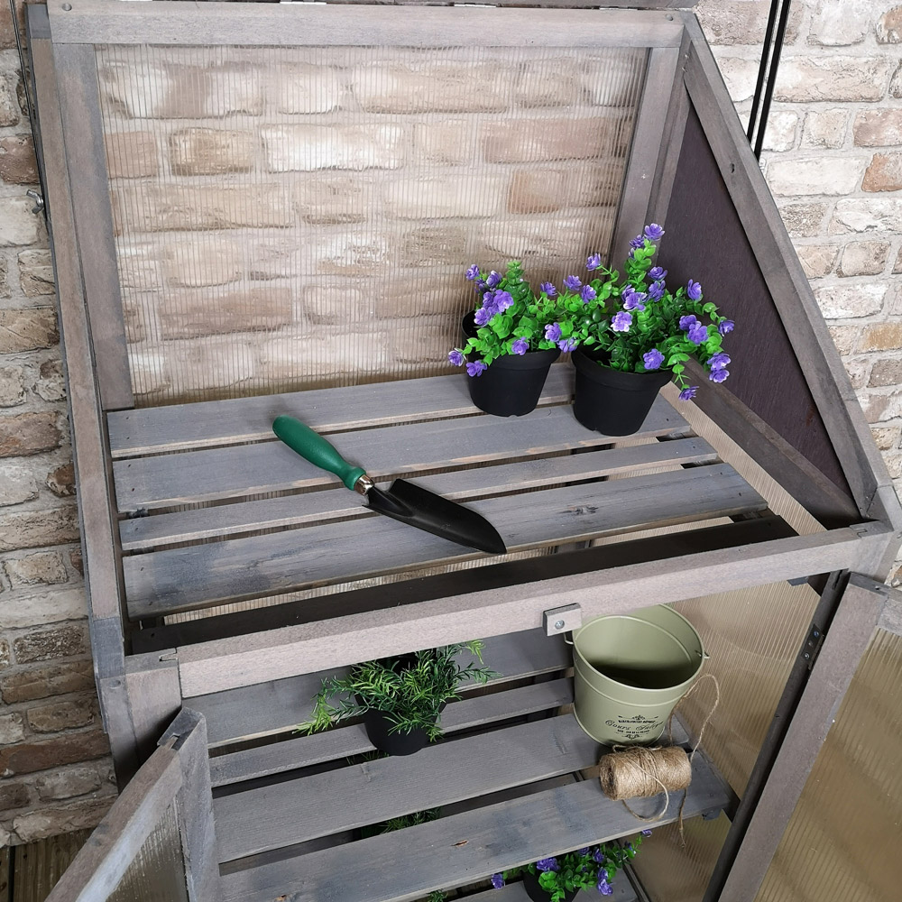This compact grey wooden cold frame is perfect for smaller gardens, patios, or balconies. Ideal for nurturing seedlings, succulents, and vegetables, its polycarbonate structure provides year-round warmth, extending the growing season and protecting plants from frost. Double opening doors and lift-up roof panels, supported by sturdy metal arms, ensure easy access and ventilation. Crafted from pre-treated wood, it',s ready for immediate installation. Three slatted wooden shelves, each with a 15kg weight capacity, offer ample storage. Simple assembly is guaranteed with the included instructions. Dimensions: H120 x W69 x D49cm.