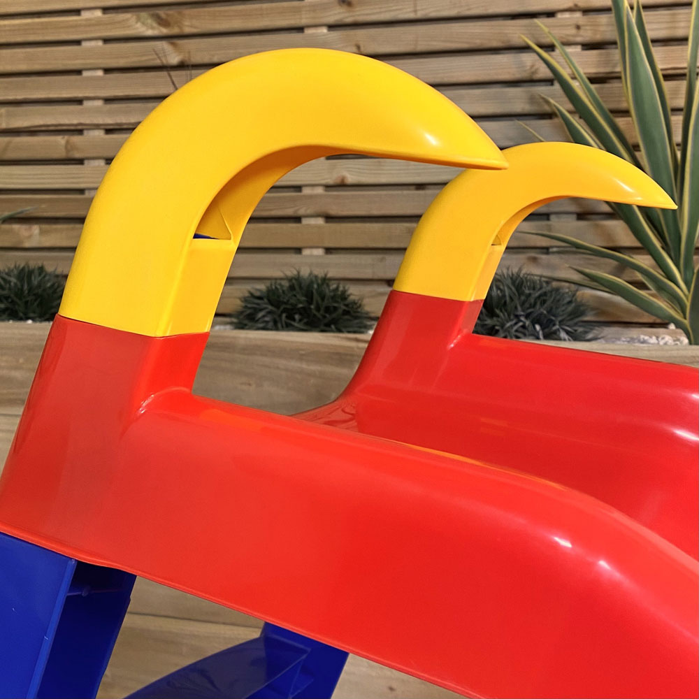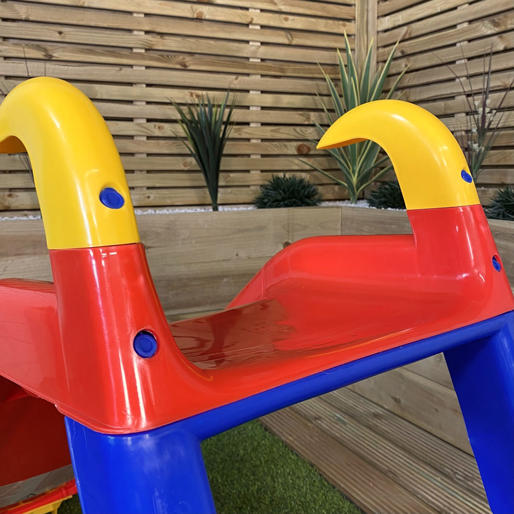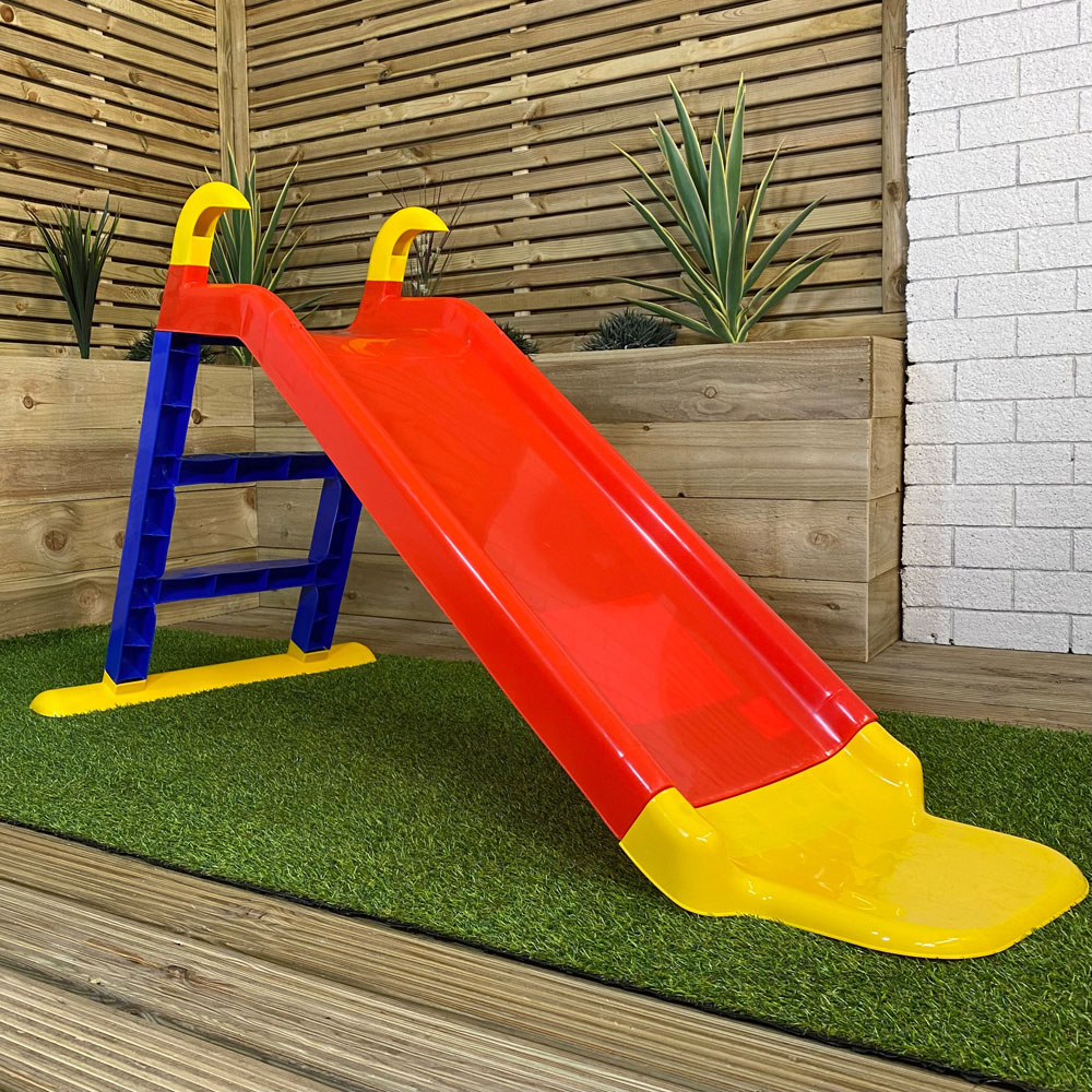 Give your little ones hours of fun with the Samuel Alexander Kids 31-inch Freestanding Plastic Slide. This colourful slide provides safe entertainment while boosting their motor skills, improving balance, agility and coordination. Suitable for indoor and outdoor use, the fun continues regardless of the weather. Constructed from durable, robust plastic with anti-UV properties to prevent colour fading, this lightweight slide is easy to move. Features include wide, easy-to-climb steps with smooth handrails and a slide extension at the bottom to protect clothing. Quick and easy assembly and simple wipe-clean maintenance ensure it stays looking its best. Suitable for ages 12 months and above. Maximum user weight: 30kg. Product Dimensions: Total height: 80cm, Total length: 142cm, Total width: 64cm, Ladder width: 40cm, Ladder height: 65cm, Slide length: 109cm, Slide width: 39cm, Space between steps: 20cm.