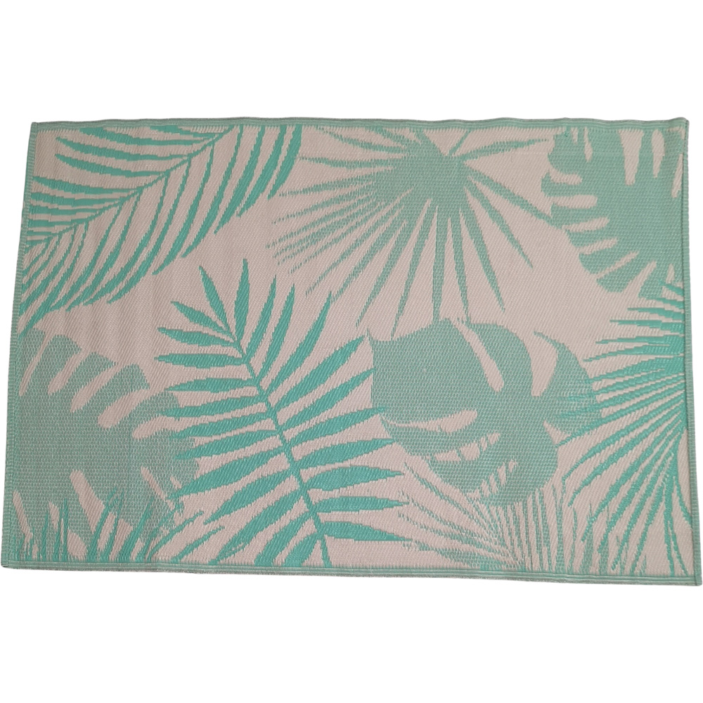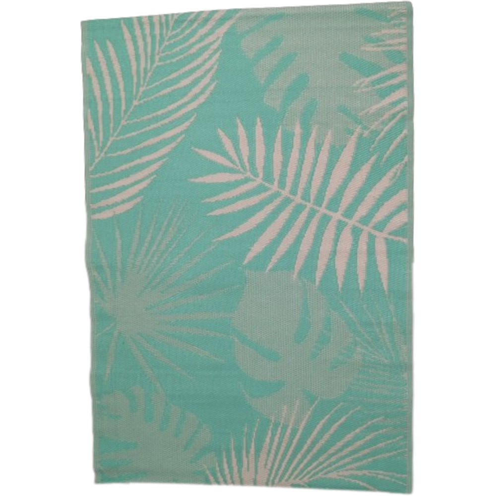 Transform your outdoor area into a stylish haven with this mint green and white geometric outdoor rug. Measuring 120cm x 180cm, it',s crafted from durable, 100% polypropylene, ensuring long-lasting use. This reversible rug offers two chic looks, perfect for patios, balconies, or gardens. The smooth surface is kind to your floors, and its UV-resistant and weatherproof design means vibrant colours that won',t fade. For optimal longevity, store indoors during winter. Cleaning is effortless, simply shake off dirt or wipe clean with a damp cloth.