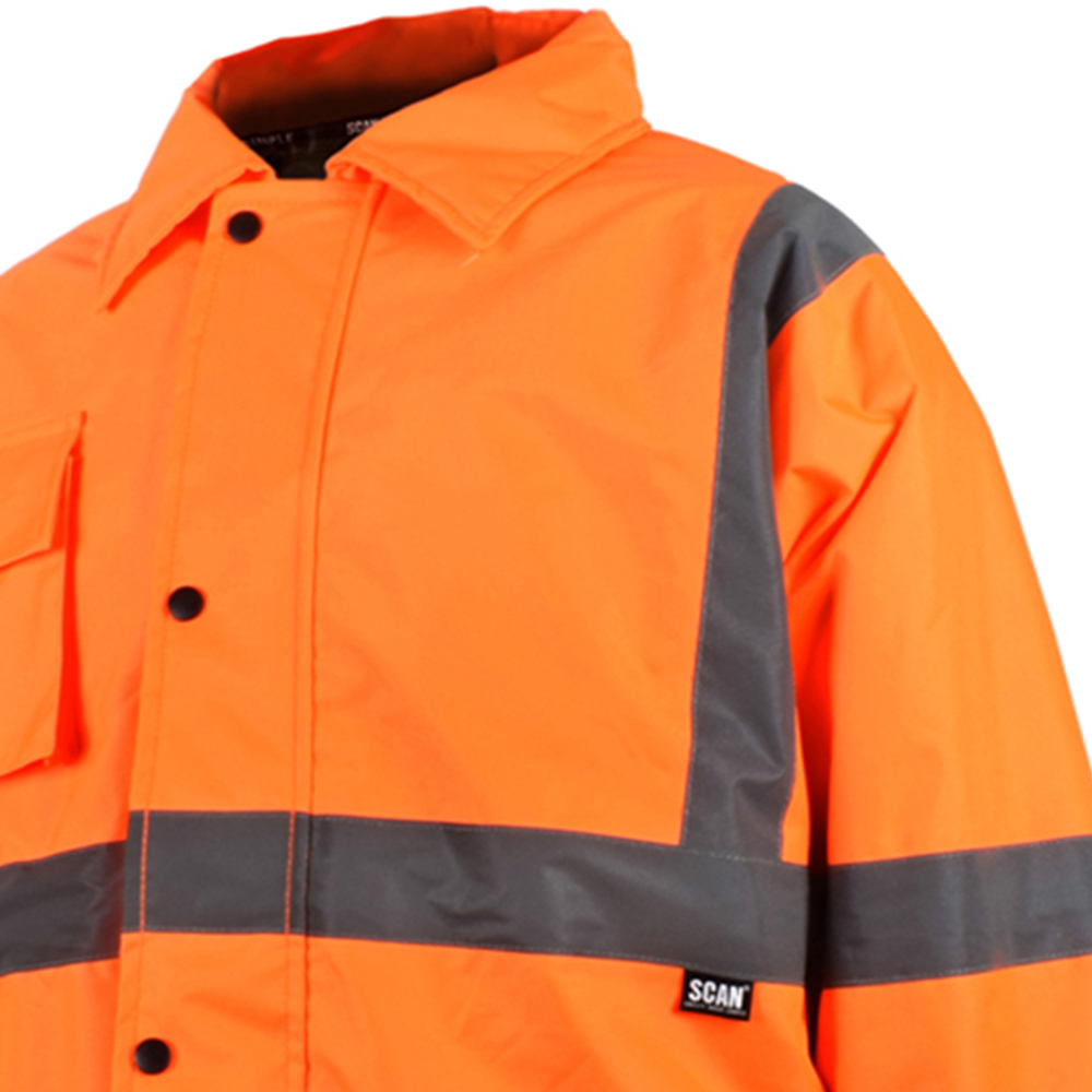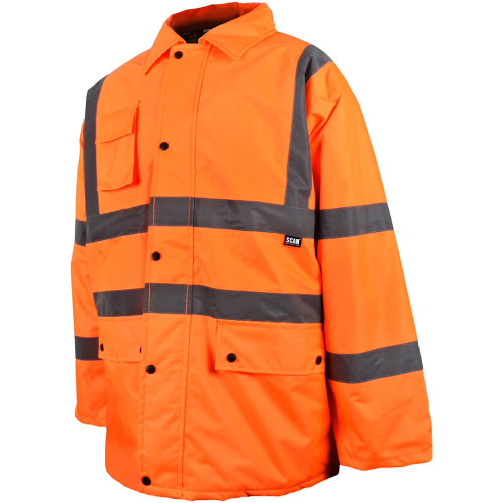 Stay safe and warm in this XXL orange motorway jacket, designed for challenging conditions. Certified to EN ISO 20471 Class 3 and EN343 Class (3.1.X) standards, it provides superior protection against harsh weather. The 300D 100% polyester shell and 190T polyester taffeta lining, with their expertly stitched and taped seams, ensure durability. A quilted liner and polyester wadding offer excellent insulation. Practical features include a heavy-duty zip, a convenient foldaway hood, a studded storm flap, and elasticated cuffs and hem for a secure fit.