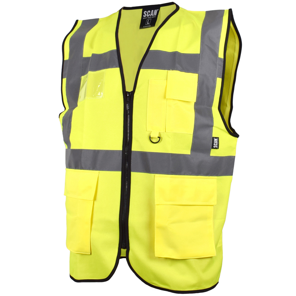 Maximize your on-site safety and organization with the High Visibility Utility Waistcoat. Meeting EN ISO 20471 Class 2 standards, this large yellow waistcoat offers enhanced visibility in low-light conditions thanks to strategically placed retro-reflecting tape across the torso, chest, and shoulders. Designed for practicality, it features a clear ID holder, D-loop, pen pocket, chest pocket, and two large storage pockets for easy access to essentials. The full-front zip closure allows for quick and easy on/off. Ideal for a variety of work environments.