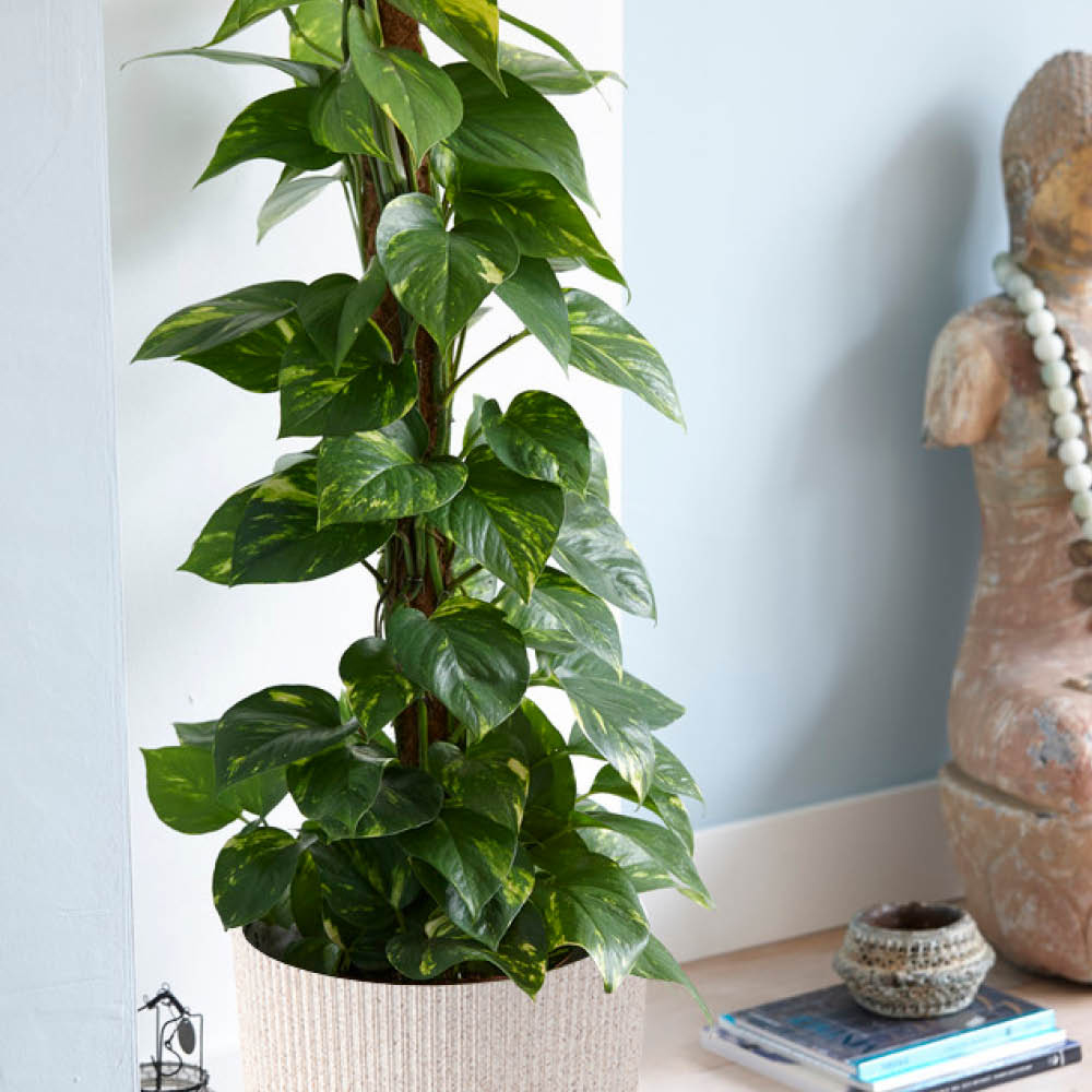 Add a touch of lush greenery to your home with this Scindapsus, a low-maintenance vine perfect for plant parents of all levels. Native to Polynesia, where it can grow up to 20 meters using aerial roots and develop leaves up to a meter across, this houseplant is much more compact. Its large, glossy green leaves are strikingly streaked with yellow. Reaching heights of 200cm and widths of 150cm, its trailing stems are ideal for hanging baskets or climbing supports (moss pole sold separately). Even in low light, it retains its vibrant colour. Simply water and trim occasionally. Delivered in a 12cm pot, it's nestled inside a stylish 14cm off-white recycled pot cover (made from 100% recycled materials, with up to 30% recycled wood chips). This watertight cover is easy to use and allows for direct placement of the nursery pot for convenient display.