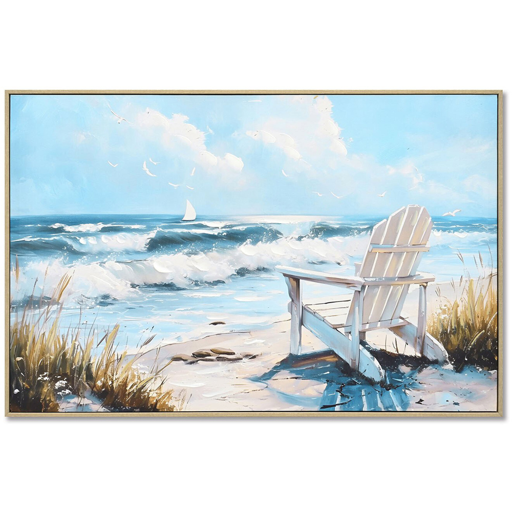 Elevate your home décor with this captivating Seashore Deck Chair Framed Art. A hand-painted scene bursts with colour, beautifully presented within a natural frame for a harmonious finish. This charming piece is perfect for adding a touch of artistic flair, complementing any interior style.