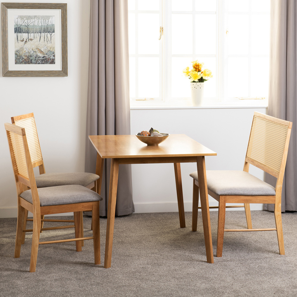 Elevate your dining area with the Austin Ellis Dining Set. This stylish ensemble, comprising a table, bench, and two chairs, effortlessly blends rustic charm with modern elegance. The sleek oak-effect finish creates a sophisticated look, complemented beautifully by the grey fabric cushions offering comfortable seating. Subtle rattan detailing adds a unique textural touch, making this set perfect for family meals, casual gatherings, or entertaining friends. Enjoy relaxed dining in style.