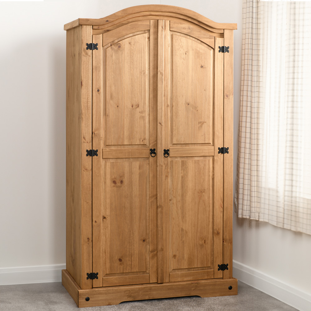 The Corona Wardrobe: A stylish and spacious storage solution for your bedroom. This wardrobe boasts two doors revealing ample hanging space, seamlessly blending functionality with attractive design. Crafted from solid pine wood with a distressed waxed pine finish, it adds rustic charm as a beautiful and practical focal point. Keep your clothing organized and easily accessible in this charming addition to your bedroom.