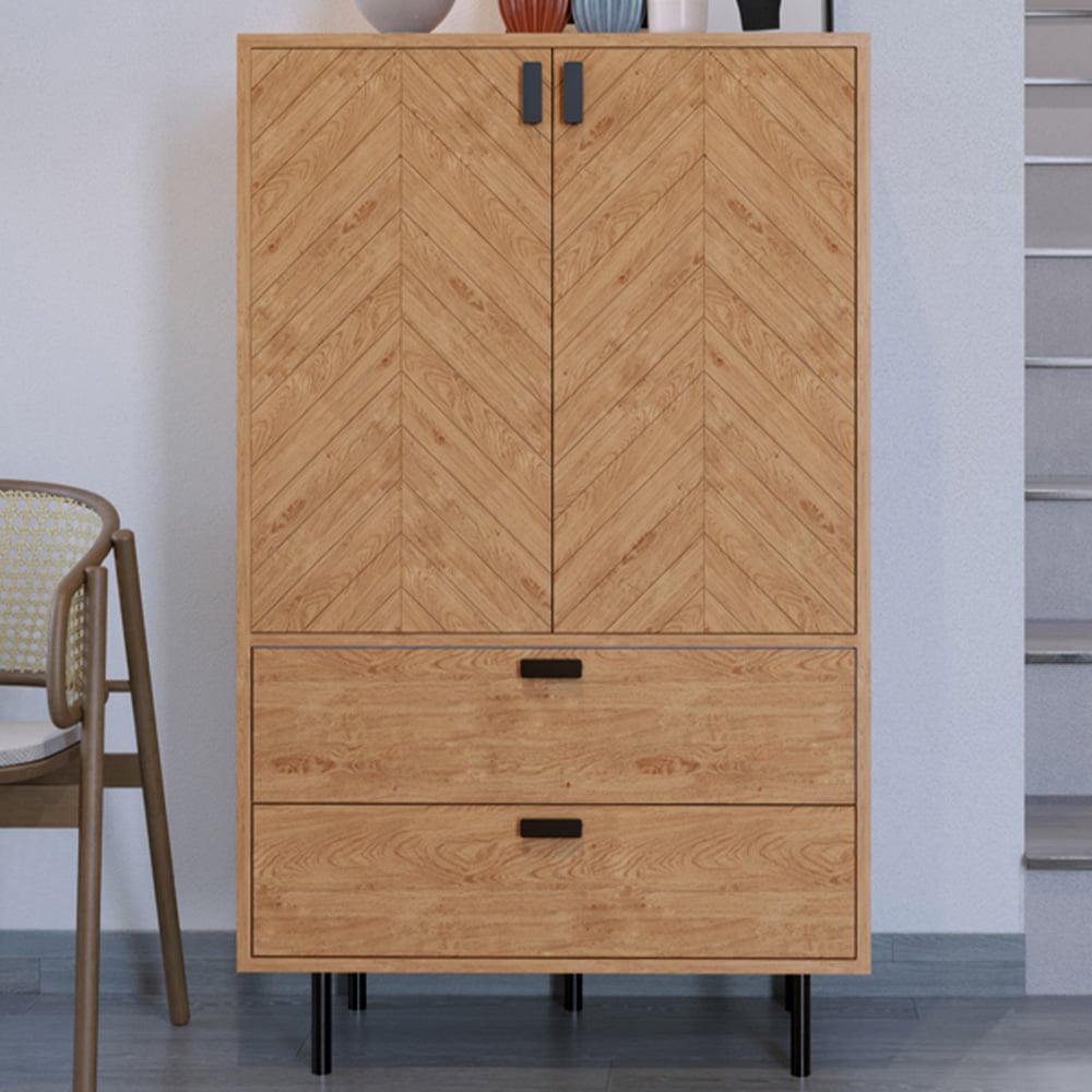 The Leon cabinet, in a stunning medium oak finish with a rich wood grain effect, brings timeless elegance to any room. Sleek black metal hardware adds a sophisticated touch to this versatile 2-door, 2-drawer piece. Arriving conveniently flat-packed for easy assembly, its clever design ensures a quick and hassle-free setup. Two drawers and two doors provide ample storage, keeping your belongings neatly organised. A perfect blend of style and practicality, the Leon seamlessly complements any decor.